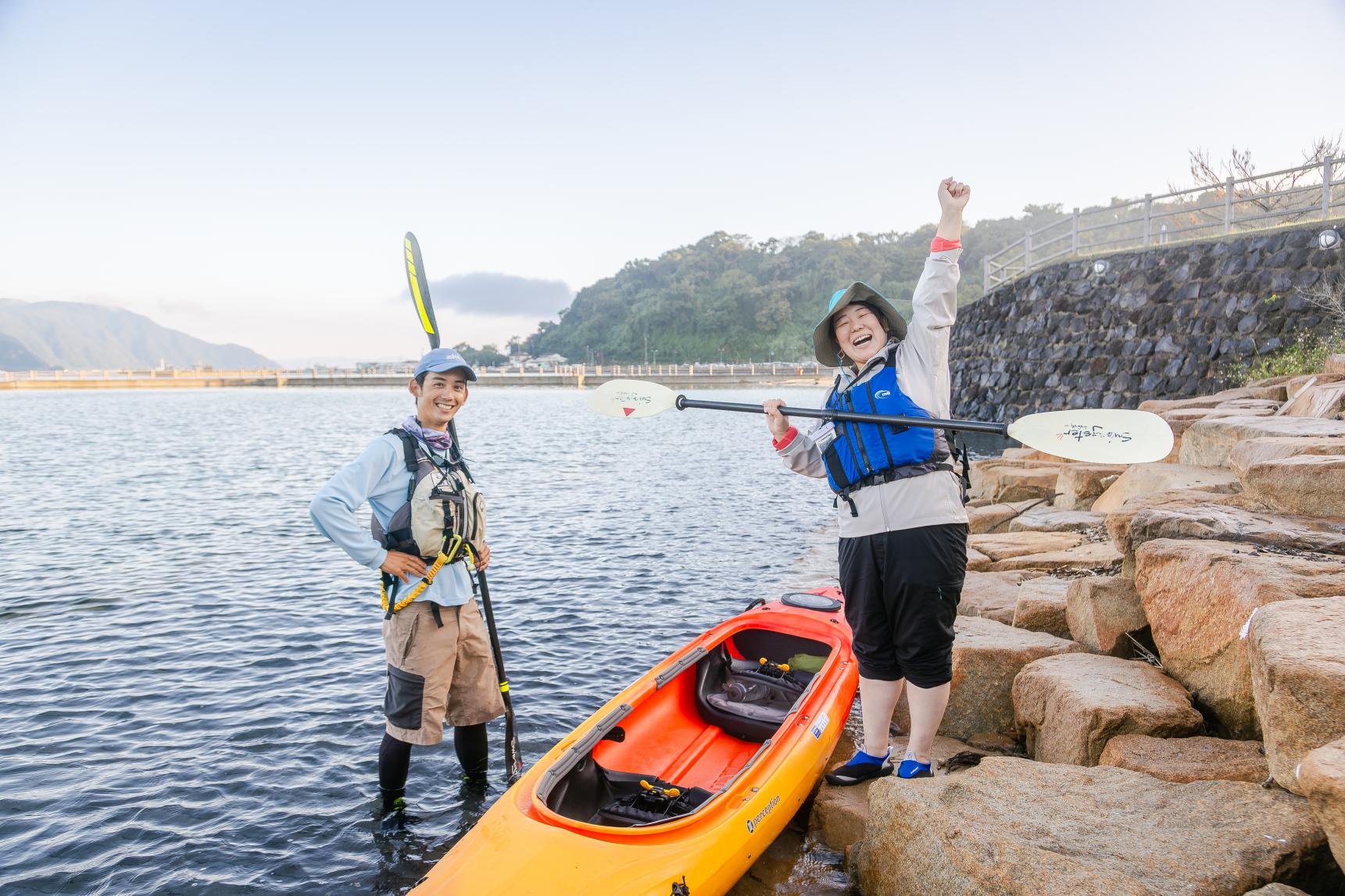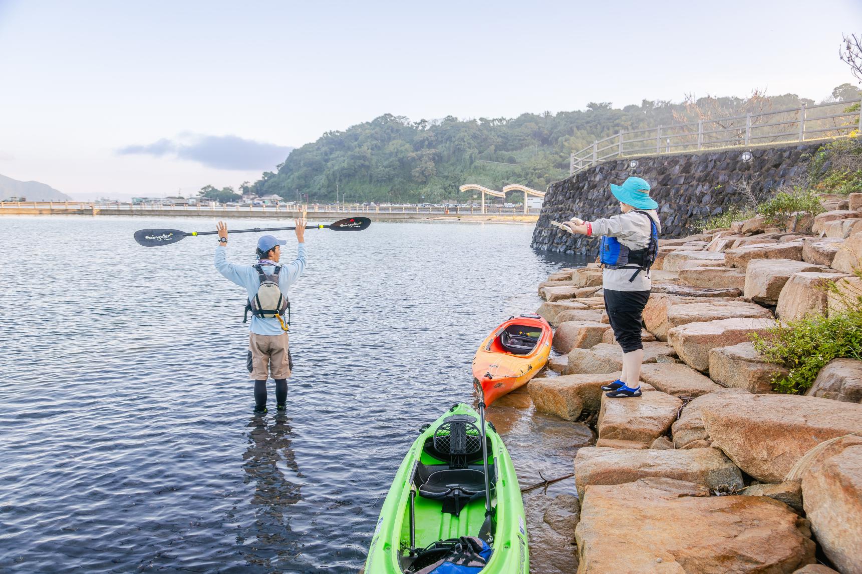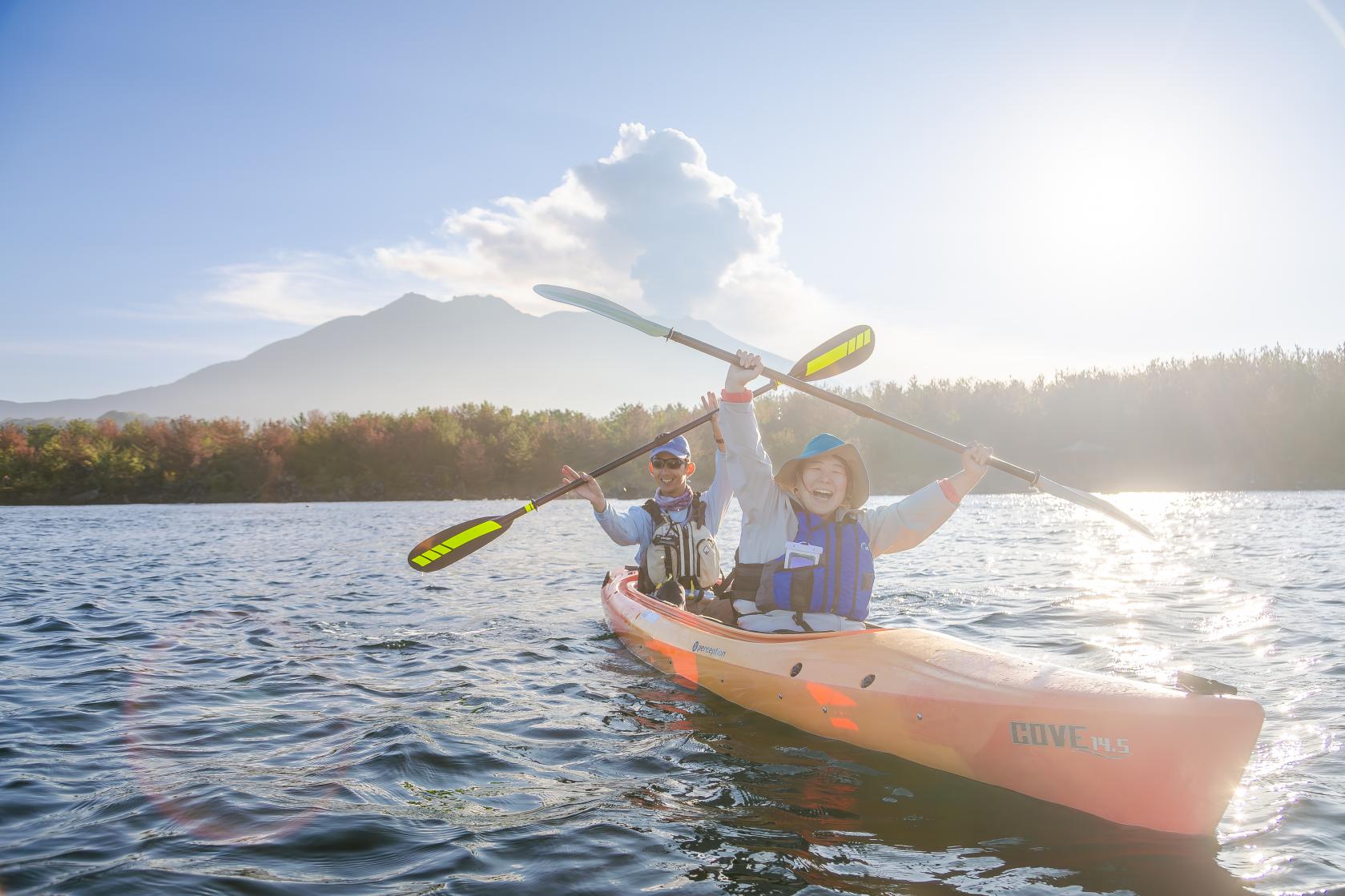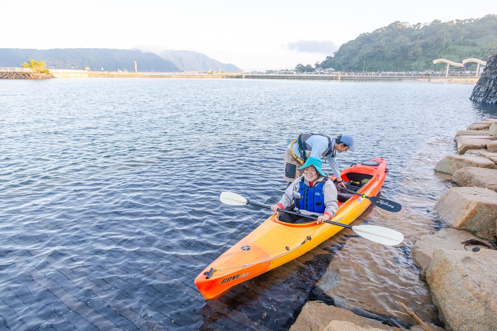 観光客に向けて桜島をガイドしているマリコカザンさんですが、実はカヤックでの桜島ツアーは初めて。今回はかごしまカヤックス野元尚巳さんと浦哲郎さんのガイドで、噴煙を上げる桜島を海から眺めながらの海上探索に出かけます。まずはパドルの持ち方、こぎ方などのレクチャーを受けて、いざ海へ。