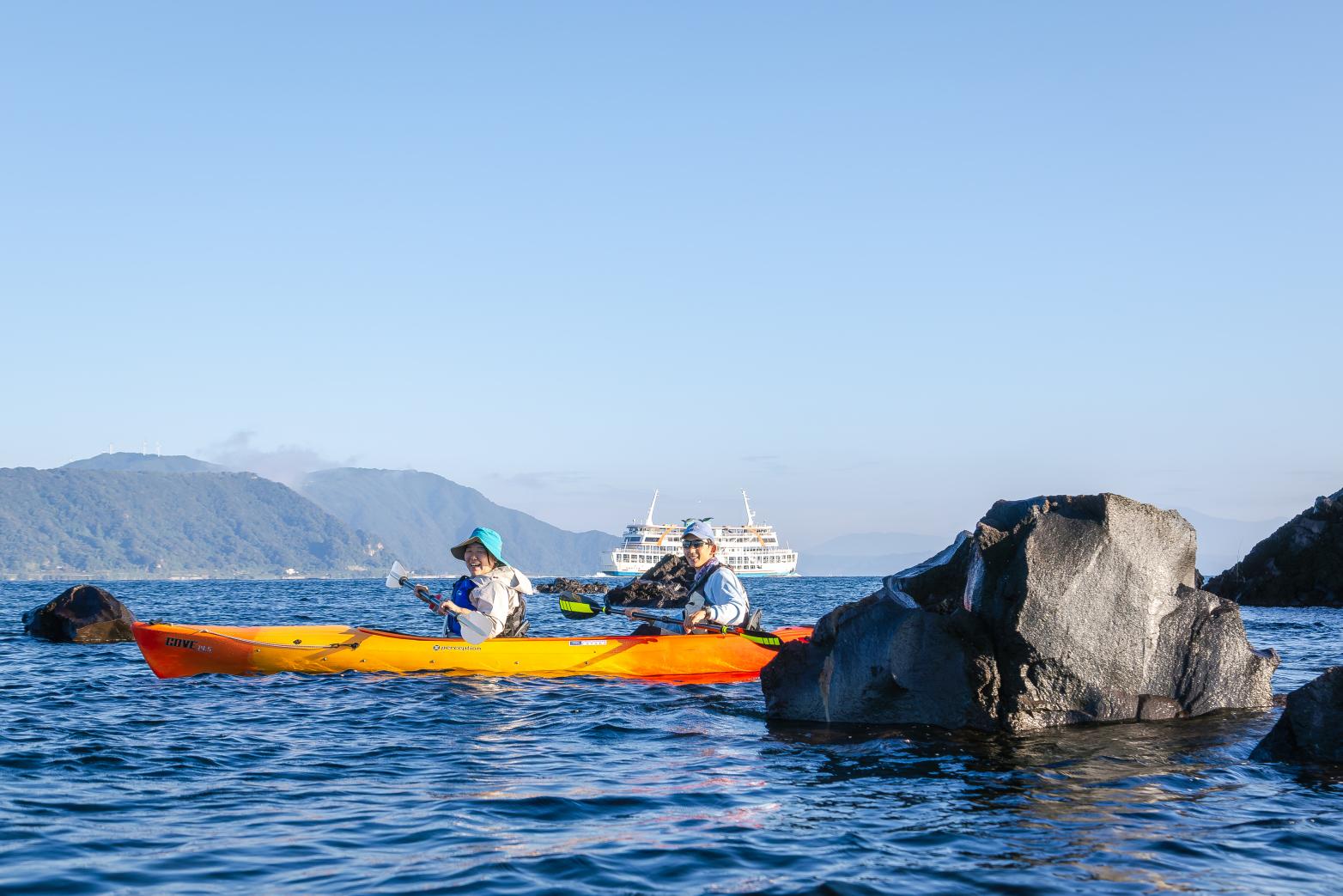 穏やかな海にこぎ出すと、海づり公園を過ぎたあたりから、ごつごつした溶岩が海面から出ているエリアに差し掛かります。溶岩は流れてきたときはアツアツですが、冷えて固まればそこには植物が生えていきます。「桜島の中でも古い時代の溶岩は木々に隠れてしまって見ることができません。溶岩を触れることはすごいことなんです」。海中をのぞき込むと、流れ出た溶岩や火山と共生する珊瑚など、火山地帯特有の景色が広がっています。「海からしか見られない桜島を体感するカヤックツアー、おすすめです」