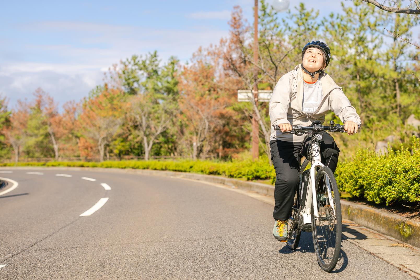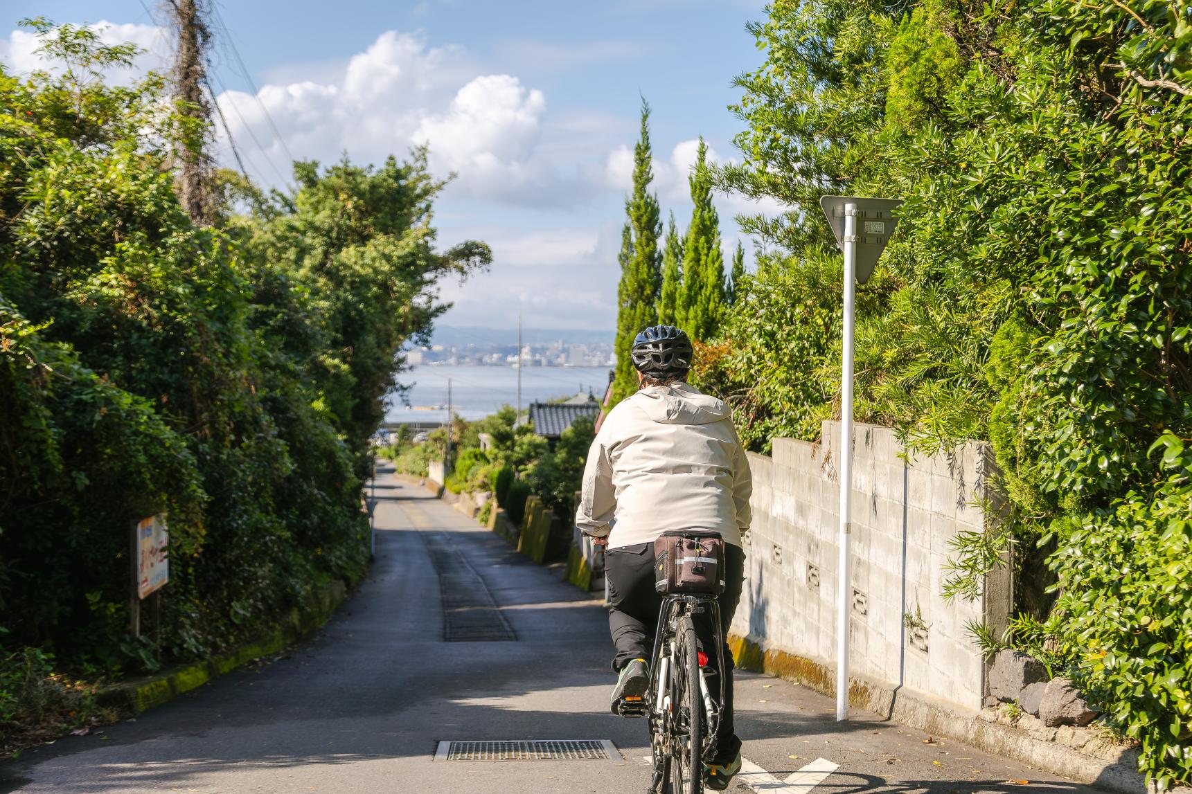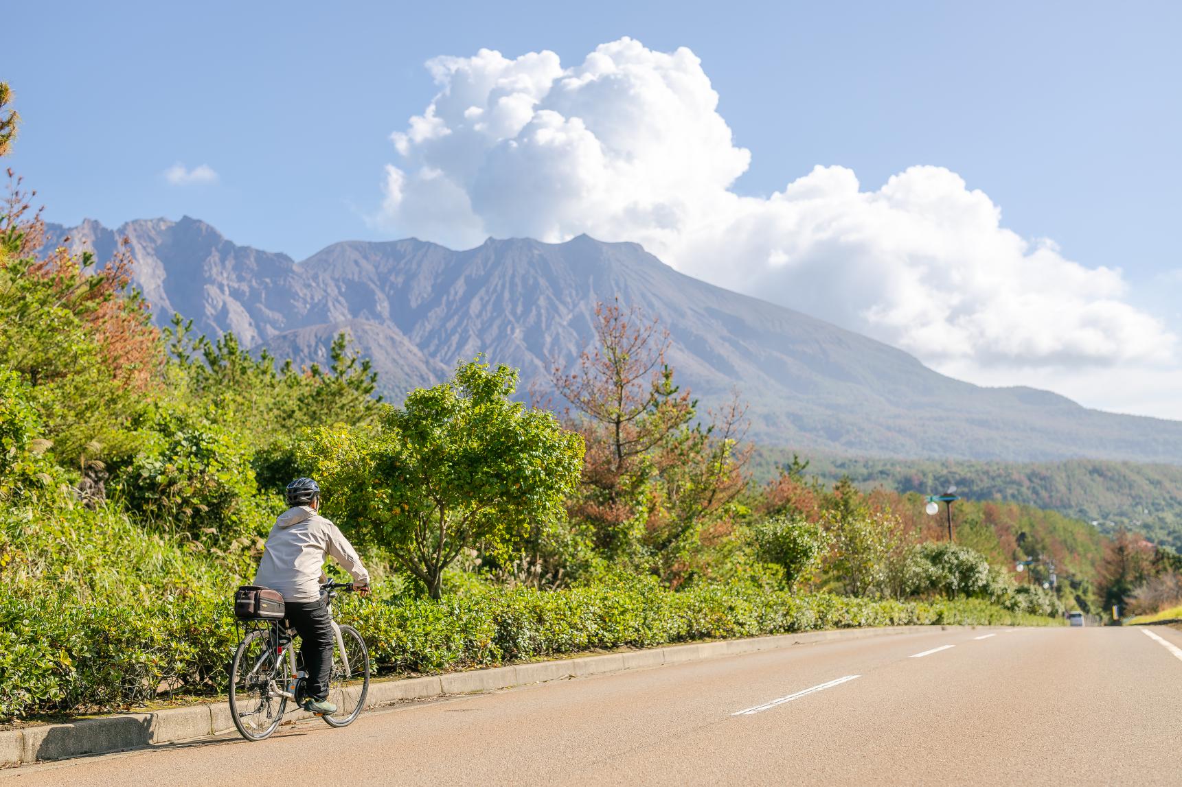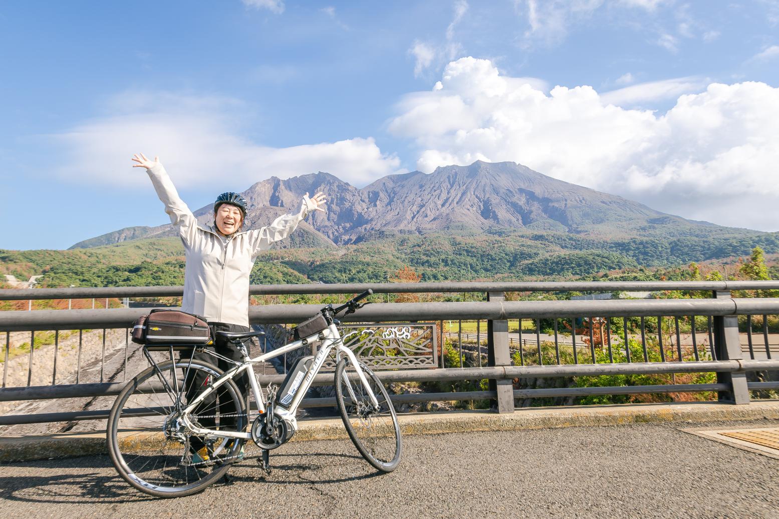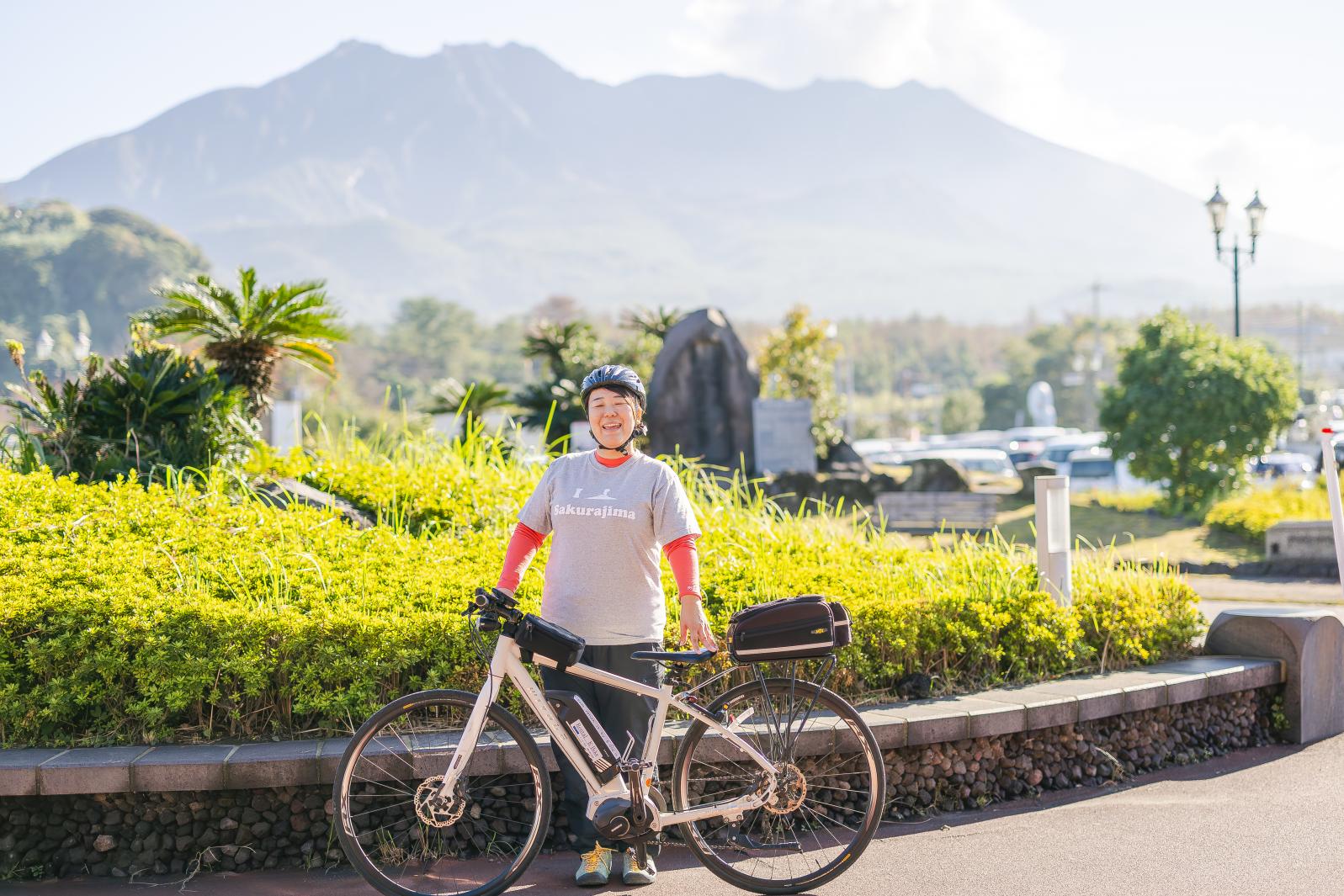アップダウンの多い桜島でサイクリングを楽しむなら、電動アシスト自転車(Eバイク)がおすすめです。坂道を上り、「湯之平展望所」で活火山の迫力を感じるサイクリングコースや桜島をのんびり一周するコースなど、思い思いに楽しめますが、今回は火山女子ならではの場所へとマリコさんが案内してくれました。