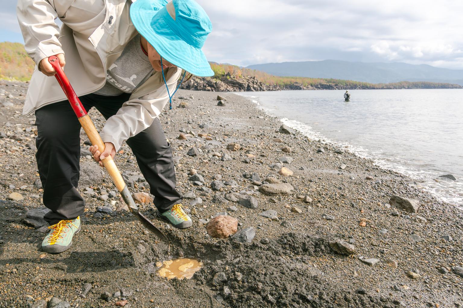 最後は、天然の温泉が湧き出す有村海岸。「潮の満ち引きや天気などの条件もありますが、スコップさえあれば簡単」と、波打ち際に近い砂浜を掘るマリコさん。すぐに湯気とともに赤茶色の温泉が湧き出してきました。「火山の恵みを感じられる体験を楽しんでくださいね」※雨の日には土石流が発生するため立ち入ることはできません。