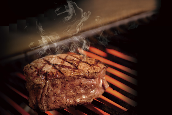 県産黒毛和牛がメインのフィレ肉ステーキ専門店で、おはしでいただくステーキが自慢。カウンター席では迫力ある炎のパフォーマンスが楽しめ、店内に広がる熱気とソースの香りが食欲をそそります。