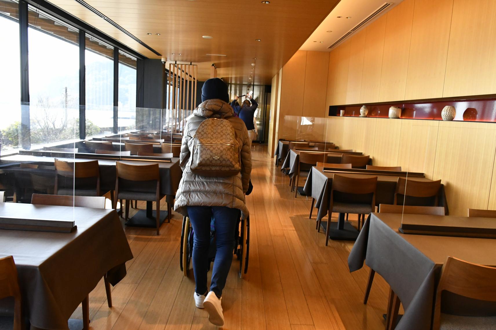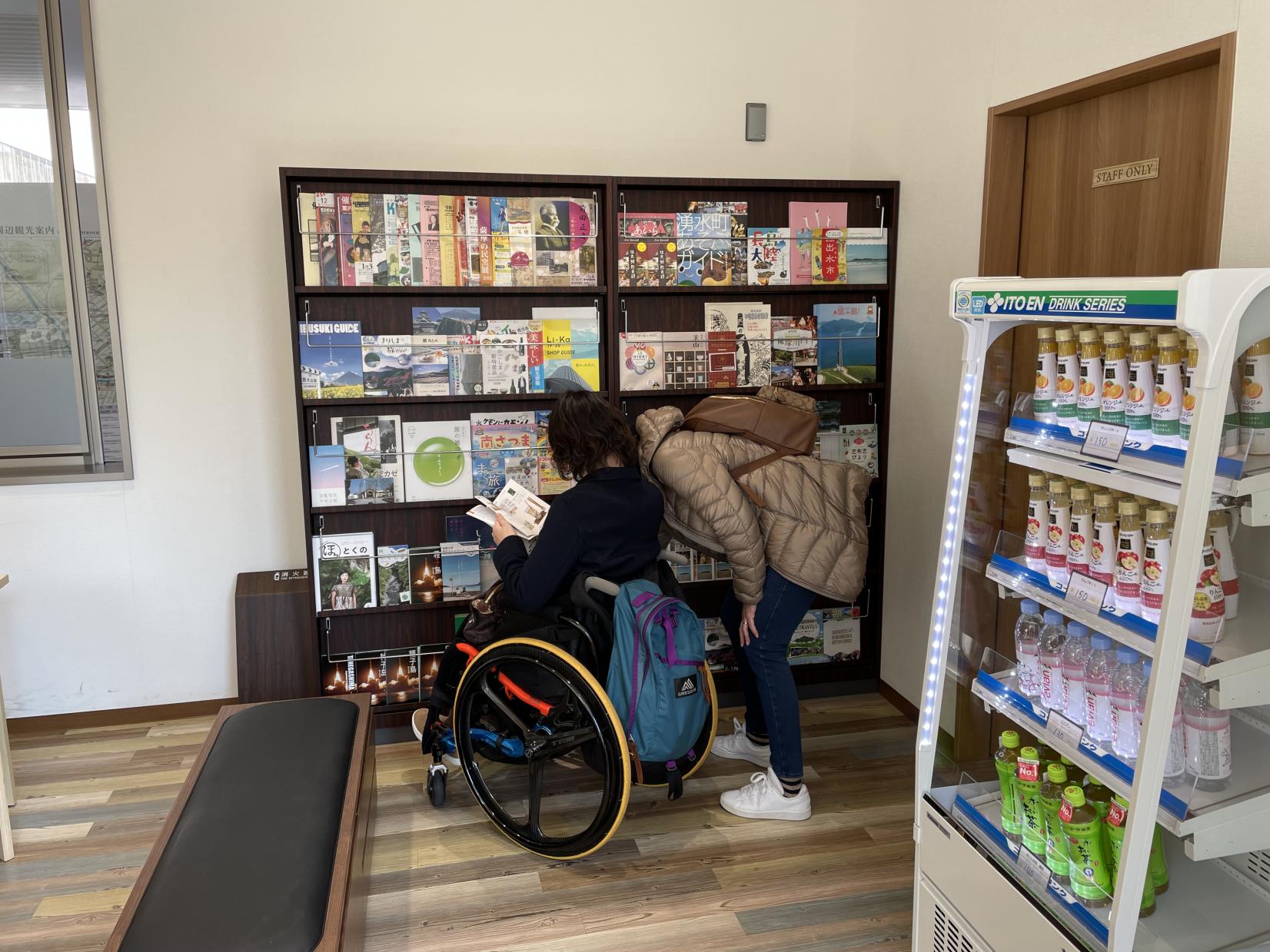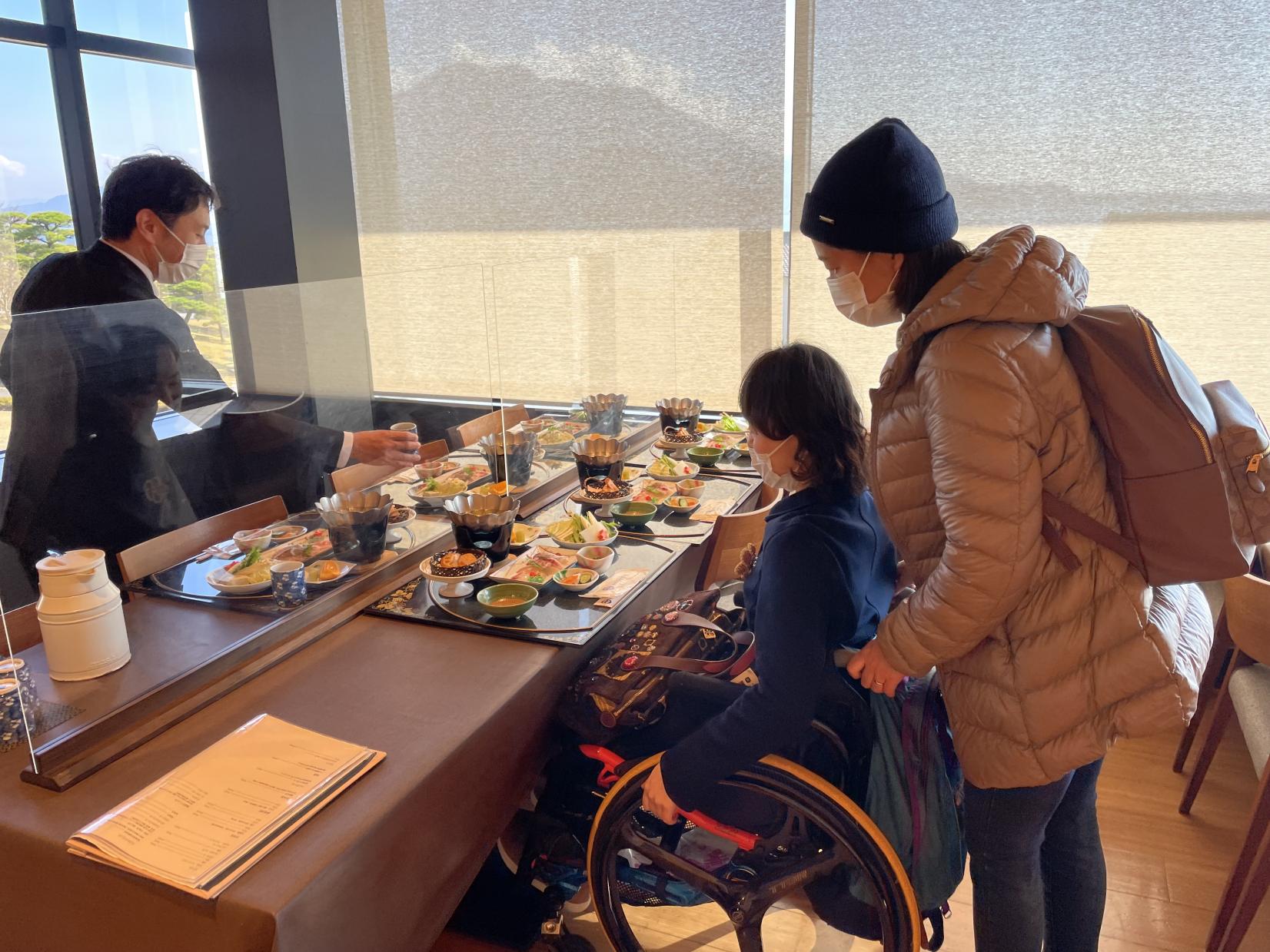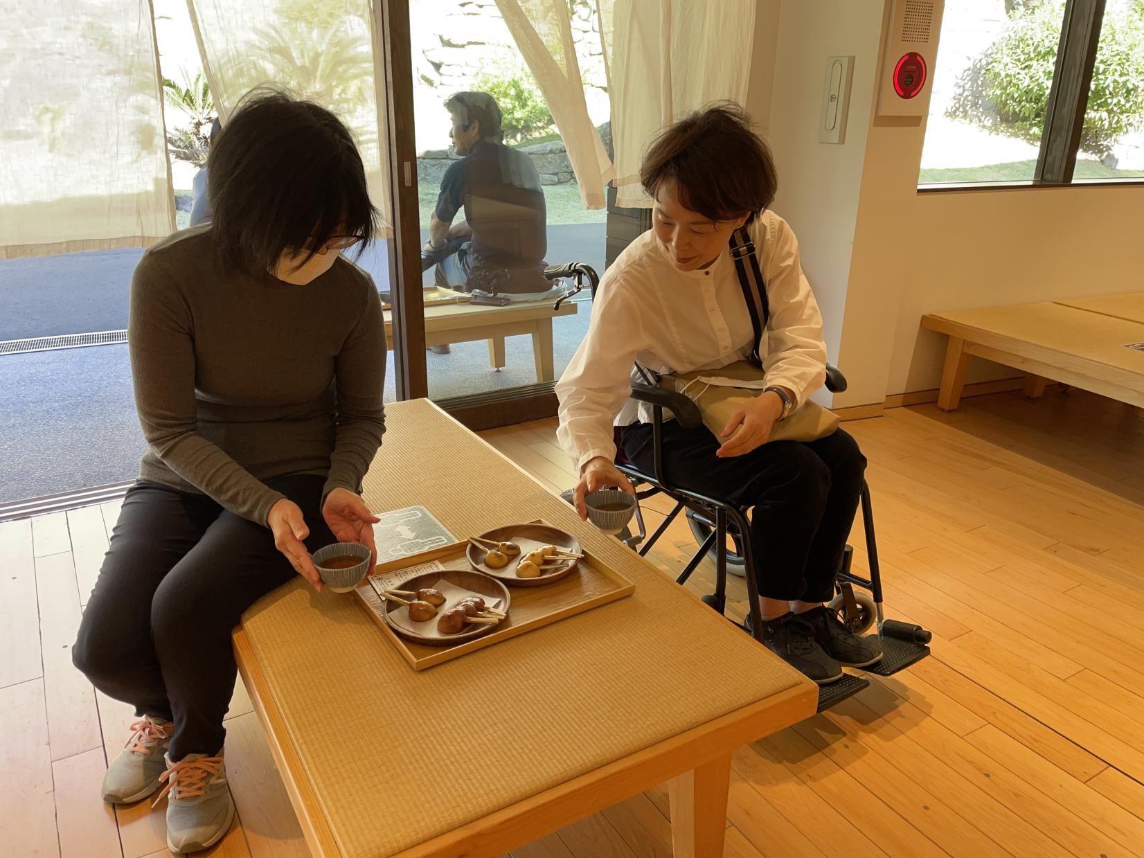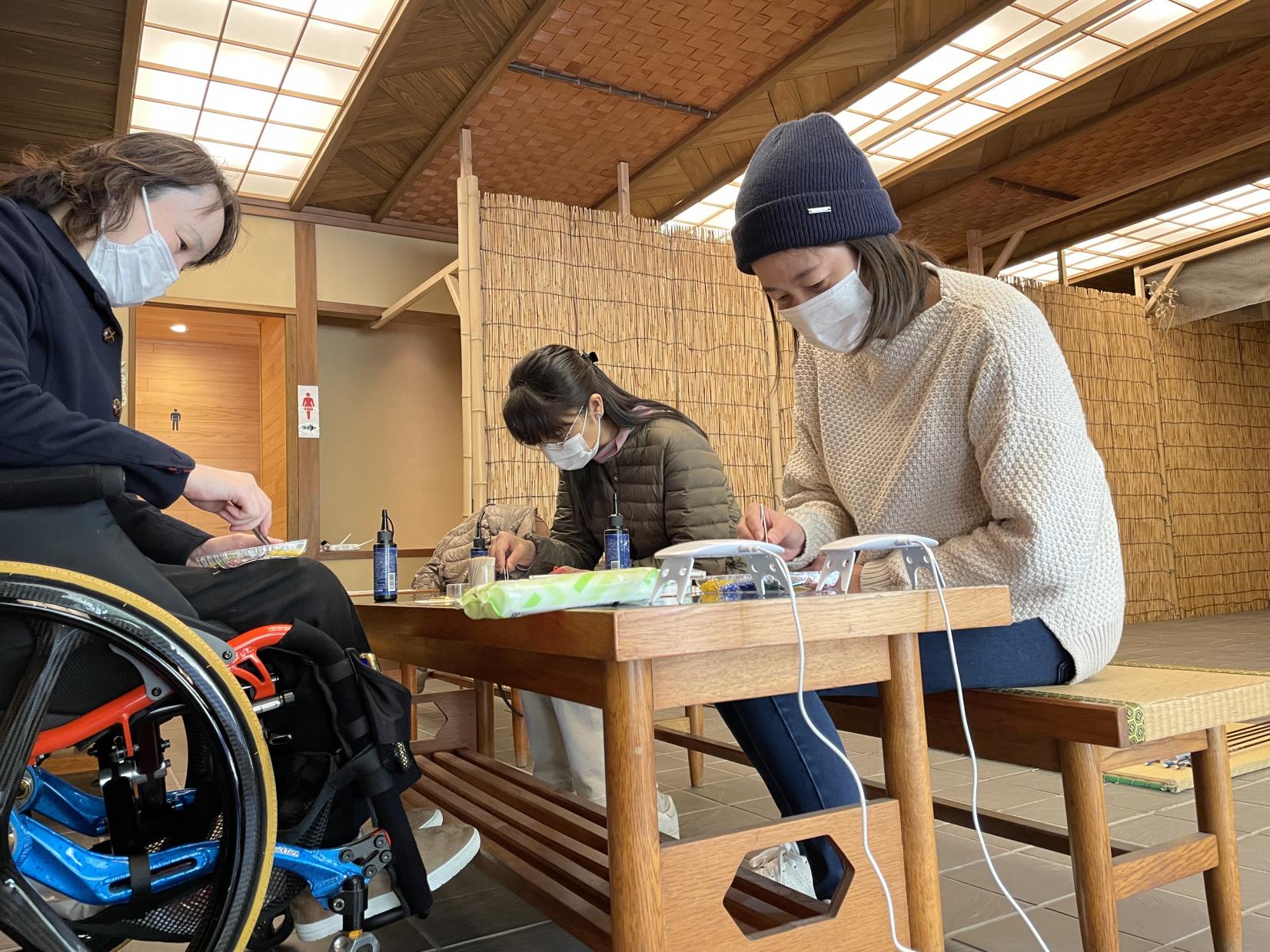 貸切風呂専門の立ち寄り湯では、浴室入口のサイズに合った車いすとシャワーチェアの貸し出しもあります。今回は「檜」の部屋をチョイス。同行者2名がお手伝いしながら一緒に入ります。「温泉は10年ぶり。初めての露天風呂も気持ちよかった~」とモデルさんも大喜び。今回の旅で最も印象に残った体験だったそうです。