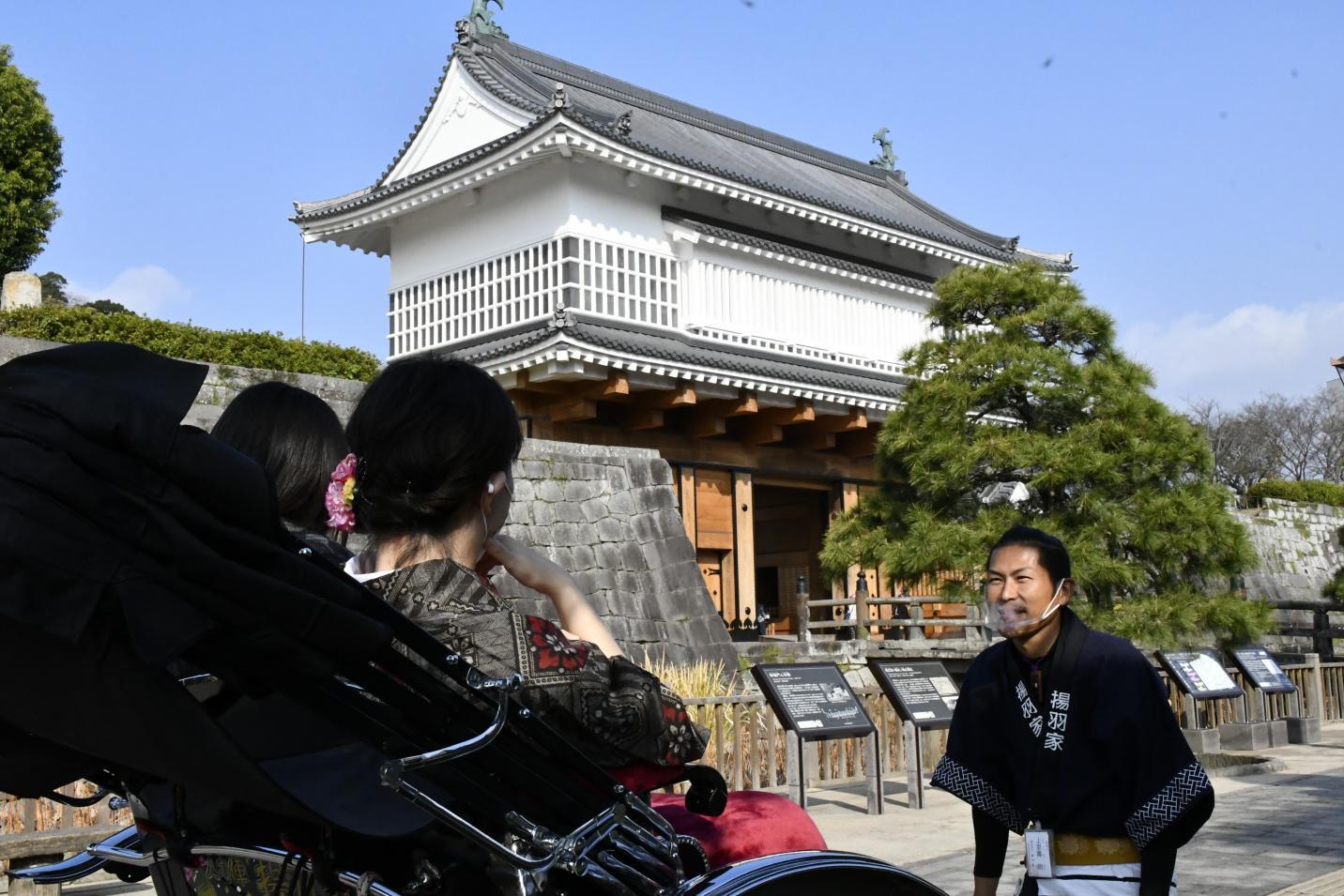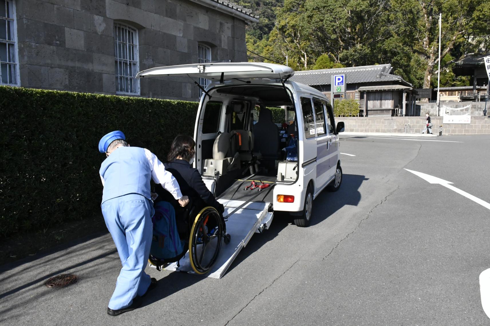 福祉タクシーに乗り込み、仙巌園を目指します。ドライバーさんは、介護の資格もお持ちだとか。慣れた様子でスロープを準備し、あっという間に車いすごと固定します。モデルさんは、「実は、福祉タクシーは揺れを感じることが多く少し苦手だったのですが、今日はとっても快適。段差がある箇所は減速されたり、ガタガタしやすい軌道敷前でのアナウンスなど、ドライバーさんの心遣いのお陰ですね」とにっこり。15分で目的地に到着します。