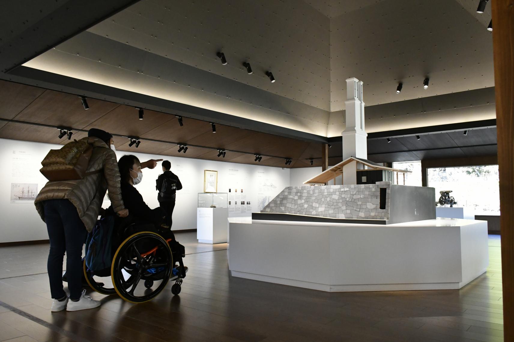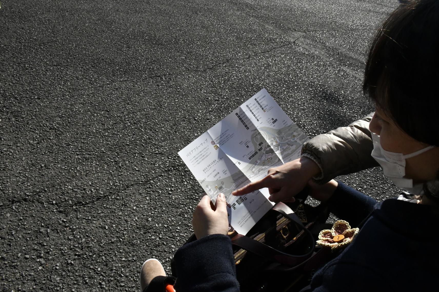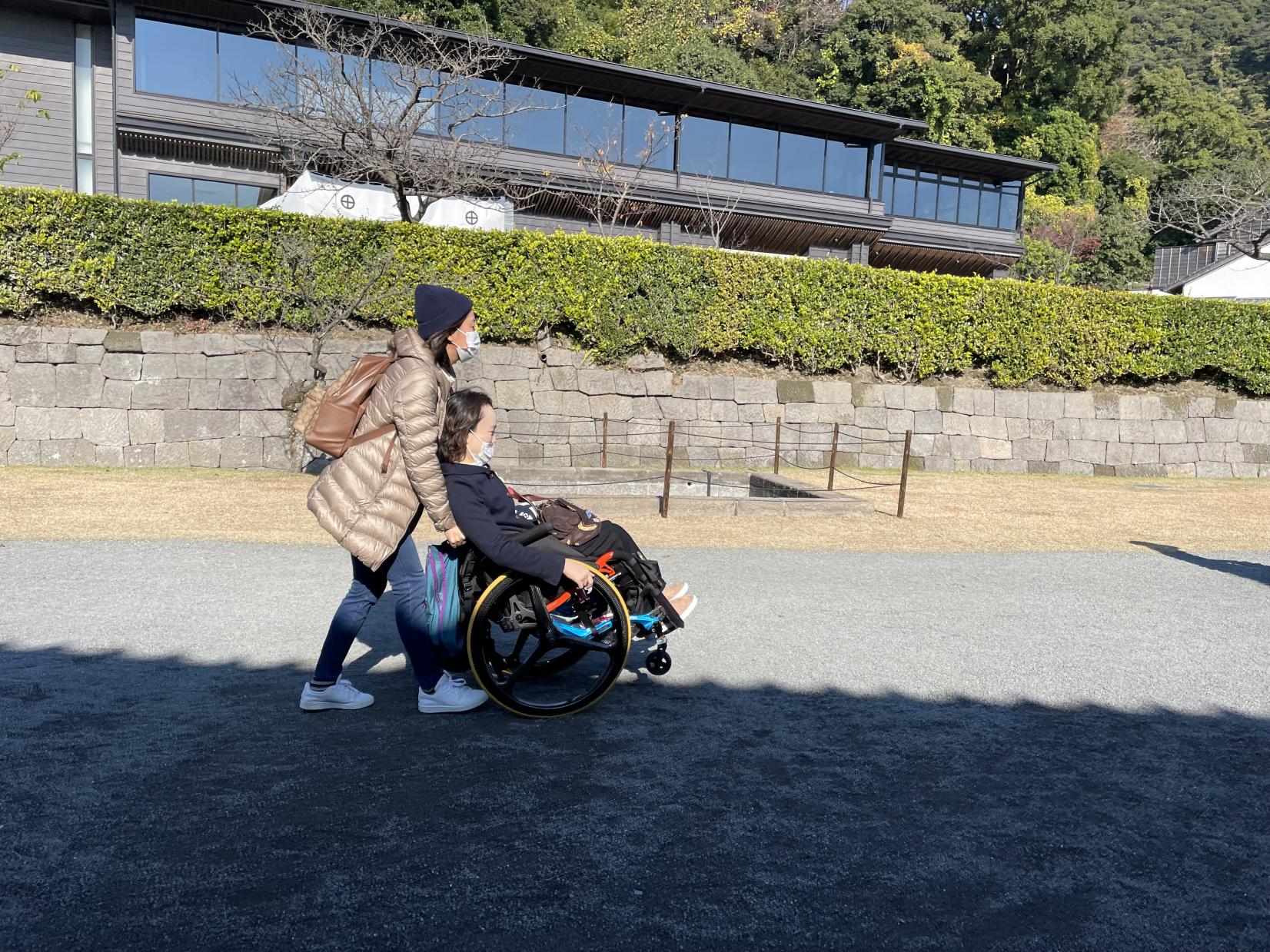 エントランスで渡されたバリアフリーマップにモデルさん感嘆!「車いすで行きづらい砂利や傾斜があるポイントが書いてあるので、事前にルートを決めることができてありがたいです。」とスタートから笑顔になりました。スタッフさんによると、「園内散策の中で、どうしてもお手伝いが必要な場所についてはご相談ください。」とのことです。今回は、お友達が車いすを押し砂利道をクリア。御殿前で桜島をバックに写真を撮ります。