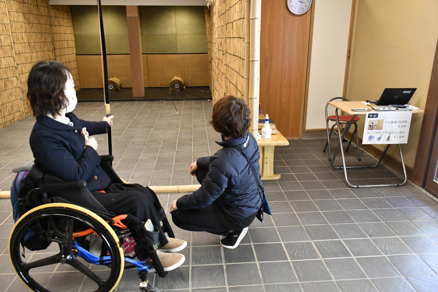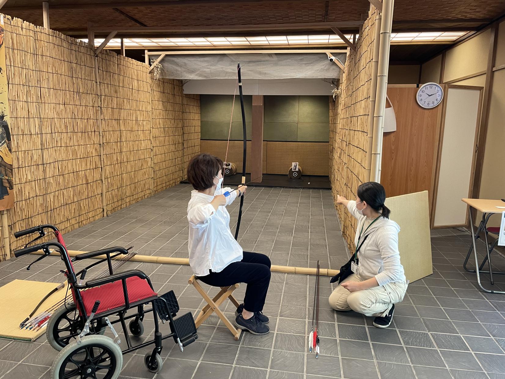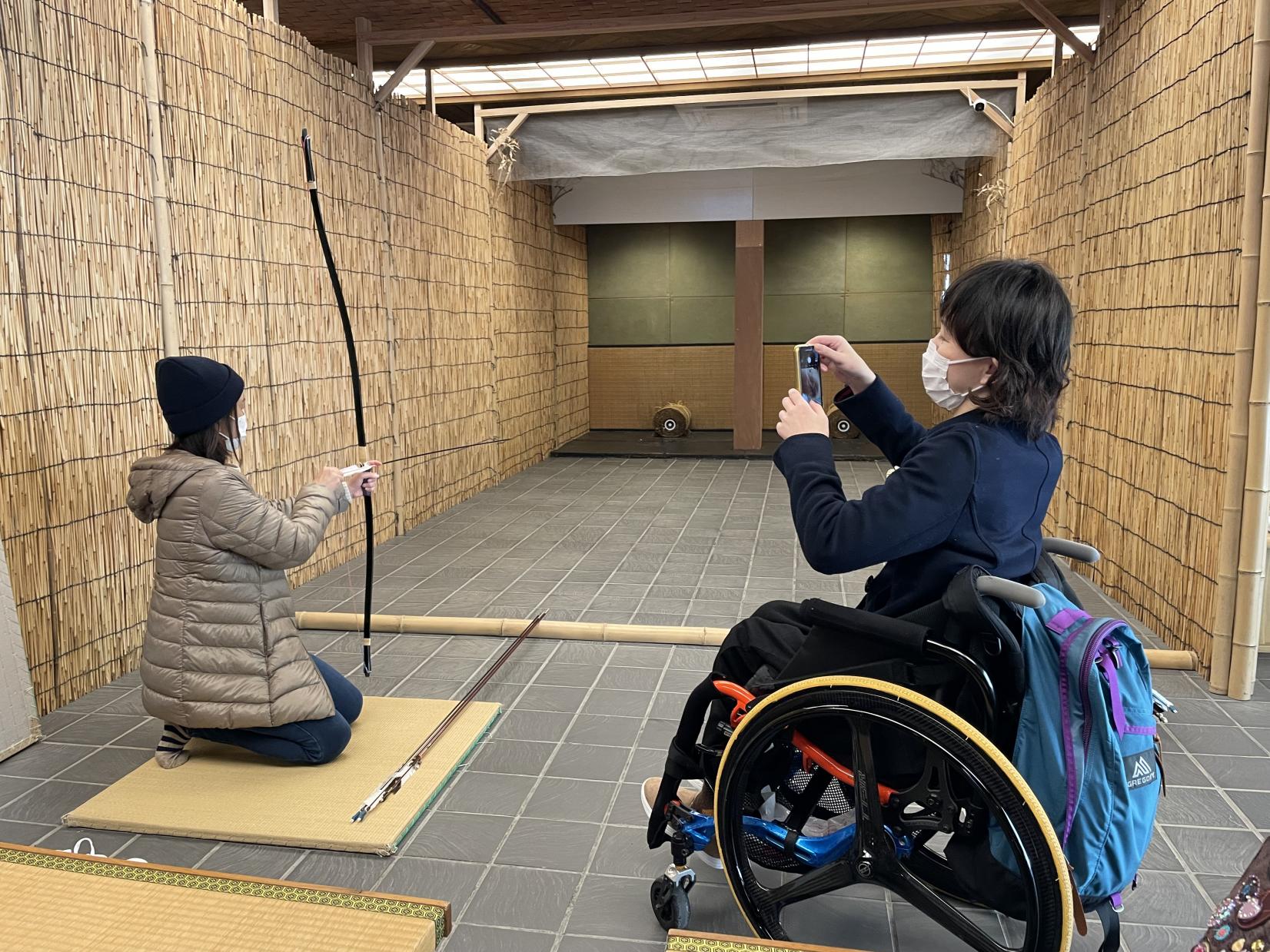 続いて、庭園内で体験を楽しみます。まずは、四半的に挑戦。少し腕の力は必要ですが、アーチェリー経験のあるモデルさんは一発で的に当たりました!お祝いの太鼓の音とともに、スタッフさんから仙巌園オリジナルバッジが授与されます。元々は島津家の武将たちが宴会の余興として行っていたもので、四半サイズの畳に正座して弓を射るものですが、畳を避けて車いすのまま、また準備してくださる椅子に座ってもOK。お子様もお楽しみ頂けますよ。
