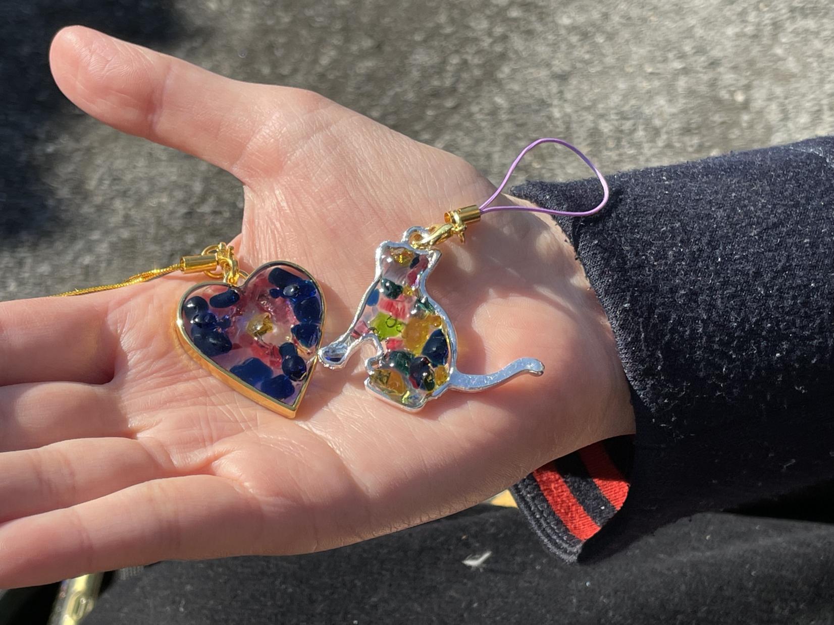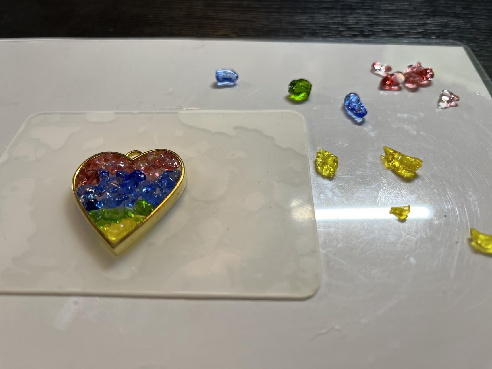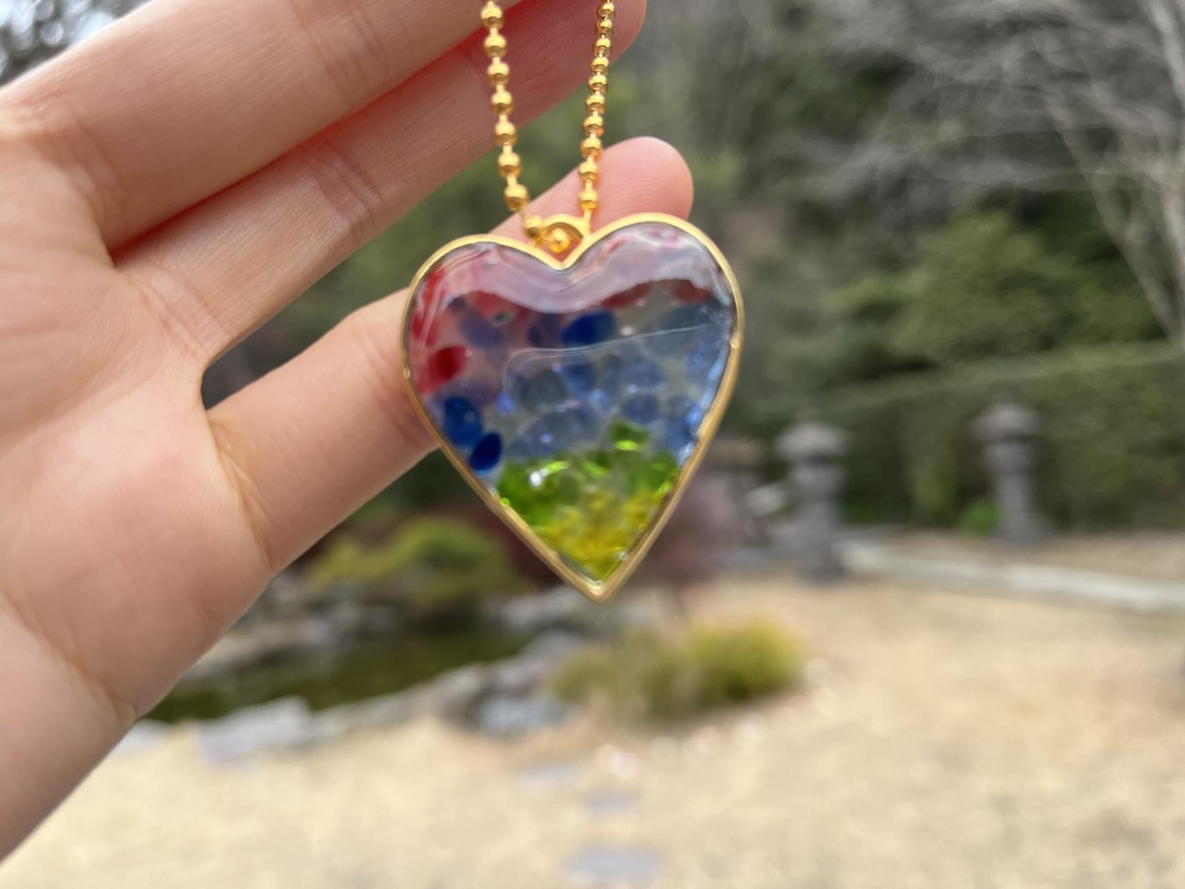 次は、色とりどりの薩摩切子の欠片を使ったアクセサリーを作ります。切子を制作する過程で出る色ガラスの欠片とのことで、こちらもまたSDGs。最初にフレームを選び、色合いを考えながら欠片を入れていきます。同系色でスッキリまとめるか、色を散りばめて華やかにするか、いやいやグラデーションも捨てがたい…「お子様も楽しめる20分程度の気軽な体験ですが、デザインや色合いを熟孝されて真剣になる大人の方も多いんですよ」とスタッフさん。最後にレジン液を入れてデザインを固め、チェーンをつけて完成!太陽にかざすとキラキラしてとっても綺麗。早速バッグにつけました。