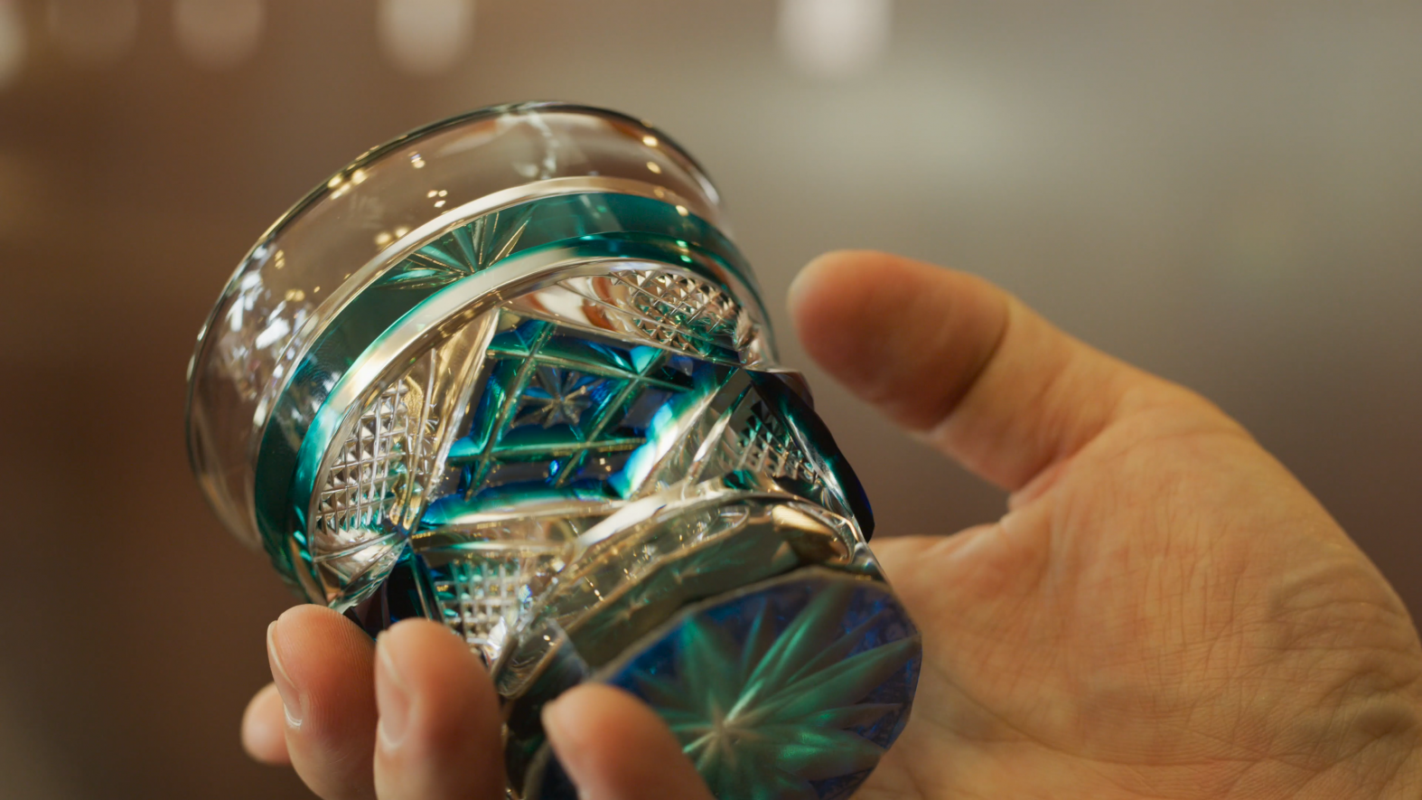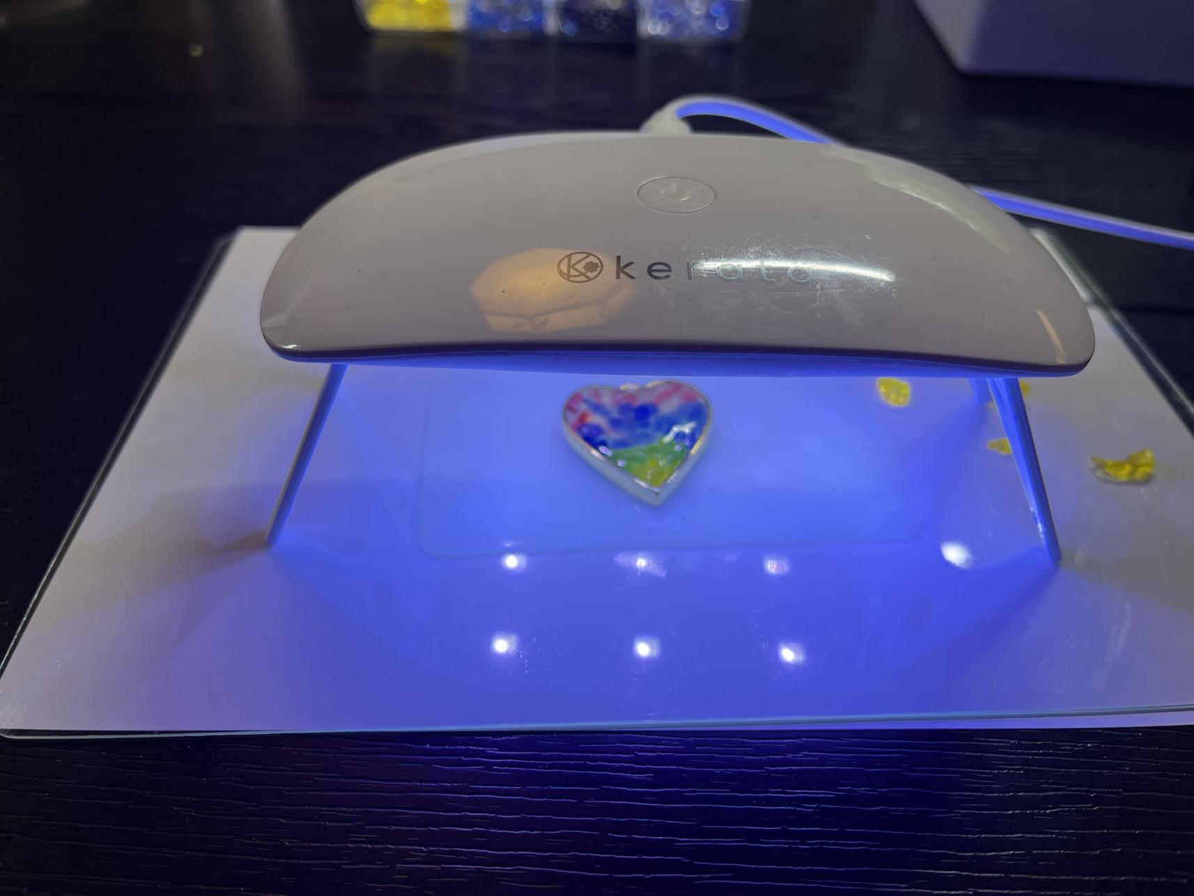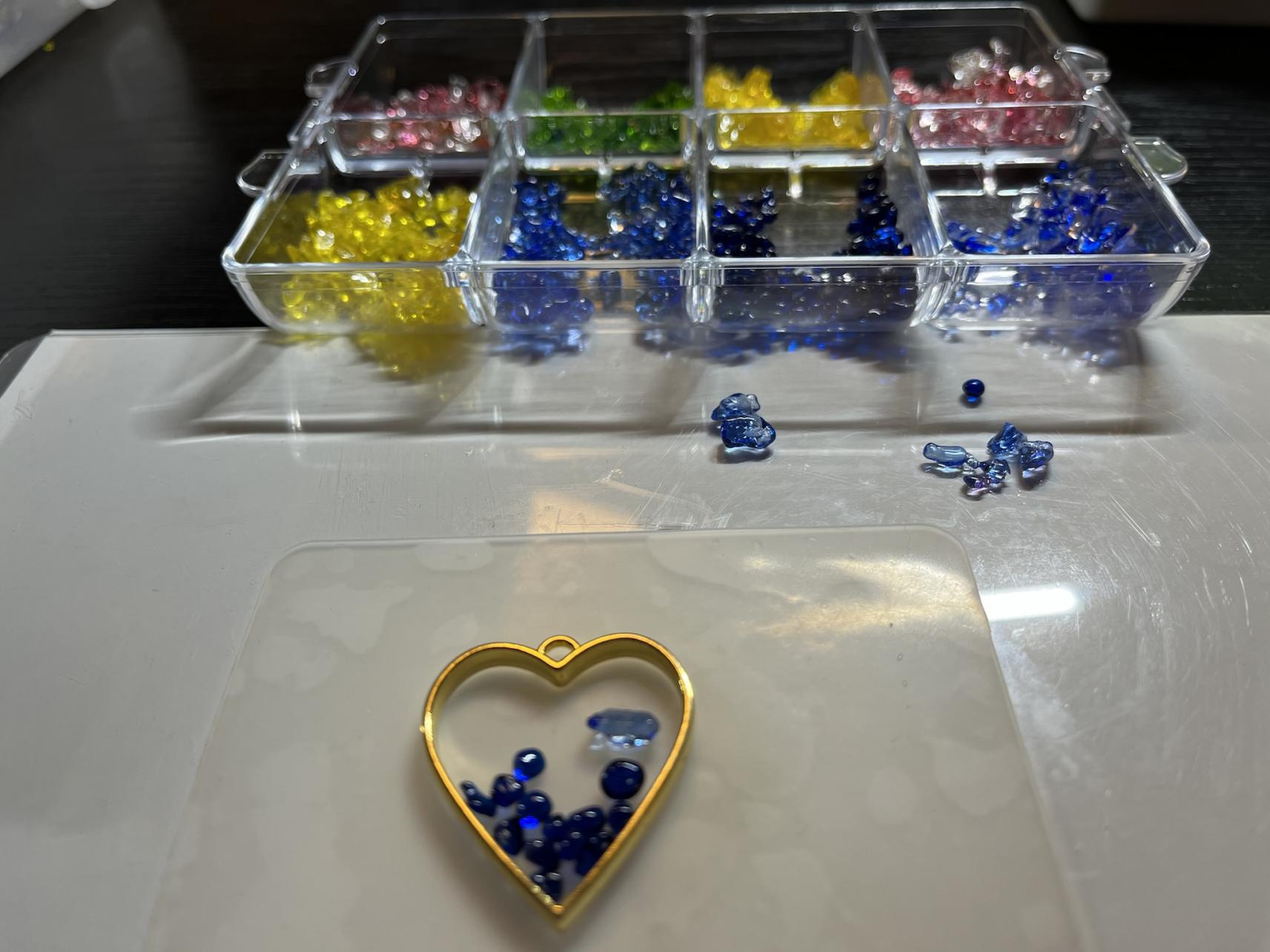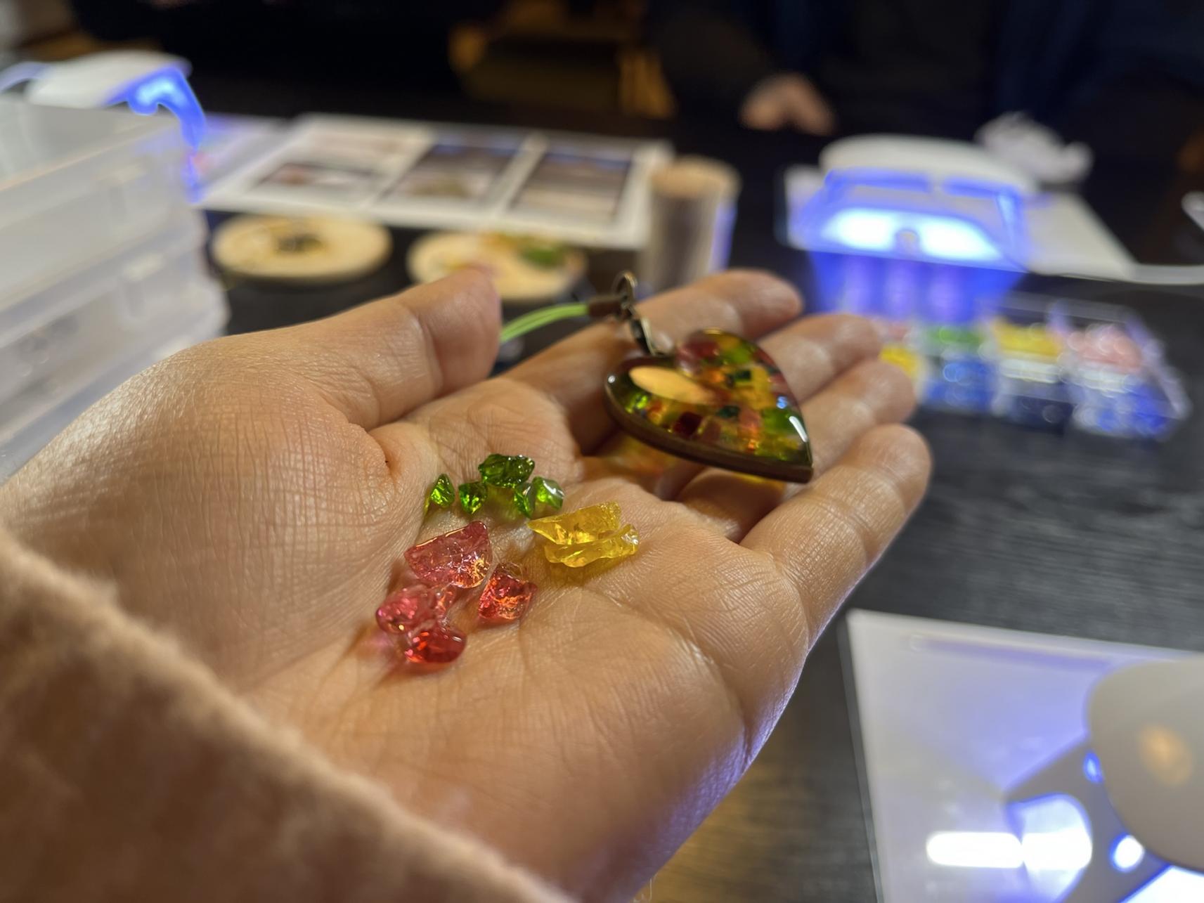 次は、色とりどりの薩摩切子の欠片を使ったアクセサリーを作ります。切子を制作する過程で出る色ガラスの欠片とのことで、こちらもまたSDGs。最初にフレームを選び、色合いを考えながら欠片を入れていきます。同系色でスッキリまとめるか、色を散りばめて華やかにするか、いやいやグラデーションも捨てがたい…「お子様も楽しめる20分程度の気軽な体験ですが、デザインや色合いを熟孝されて真剣になる大人の方も多いんですよ」とスタッフさん。最後にレジン液を入れてデザインを固め、チェーンをつけて完成!太陽にかざすとキラキラしてとっても綺麗。早速バッグにつけました。