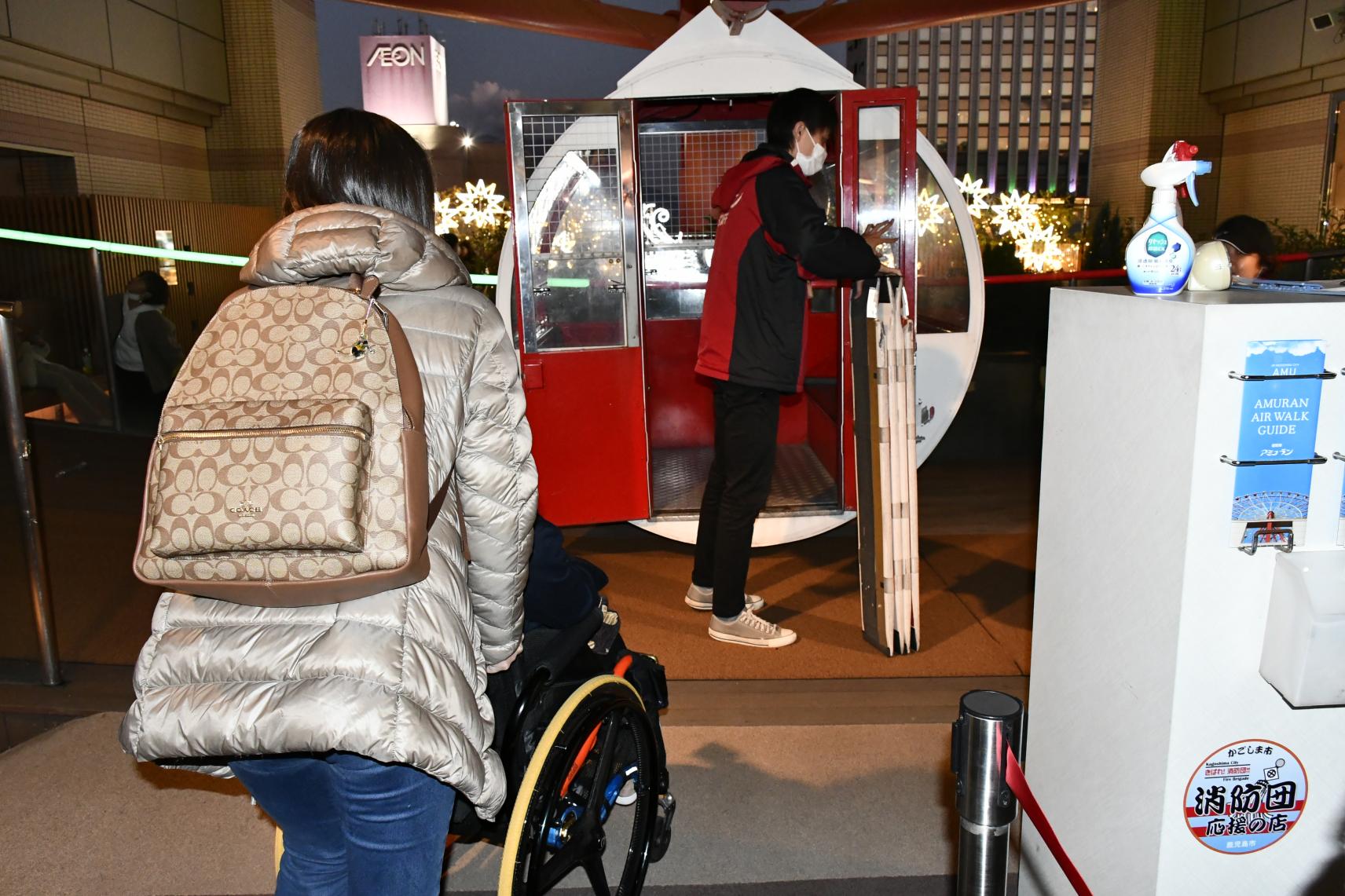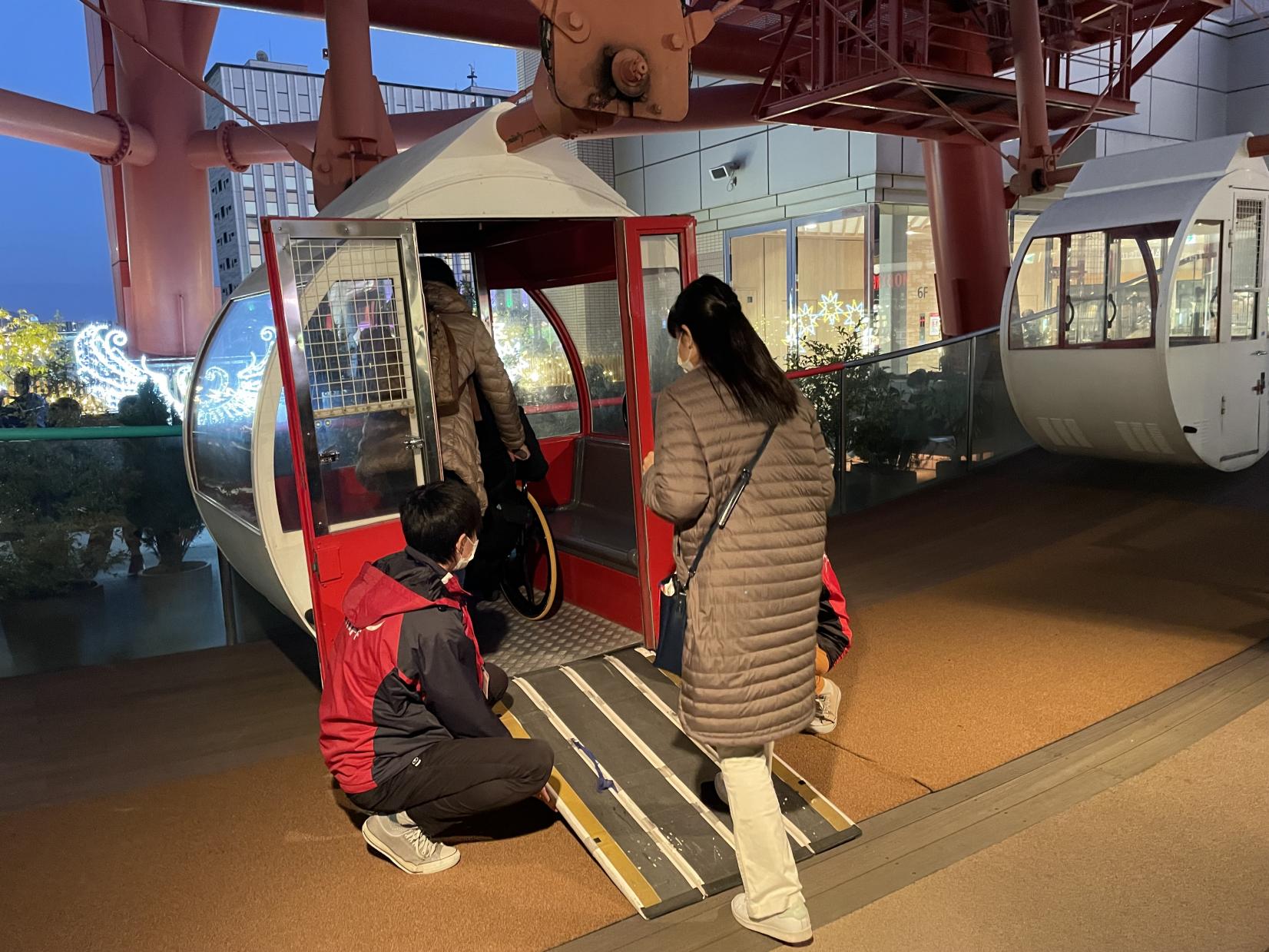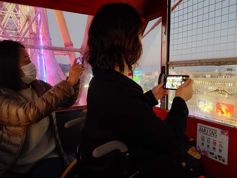 タクシーで約15分、再び鹿児島中央駅へ。ホテルで少し休憩した後に、アミュプラザ鹿児島6階にあるアミュランから夜景を楽しみます。車いす用ゴンドラは2台のため乗車のタイミングを待っていると、観覧車が一時停車し、スタッフさんがささっとスロープを設置。スムーズに3人で乗り込むことができました。「車いすの方の為に停車する旨の事前アナウンスが多い中、今回は特別に車いすに触れないアナウンスだったので、更に気兼ねなく楽しめました。」と、モデルさんも嬉しそう。