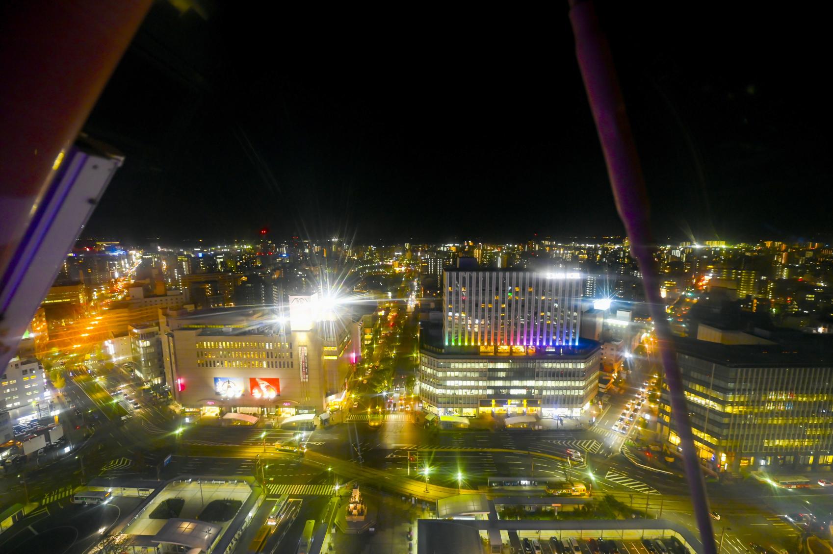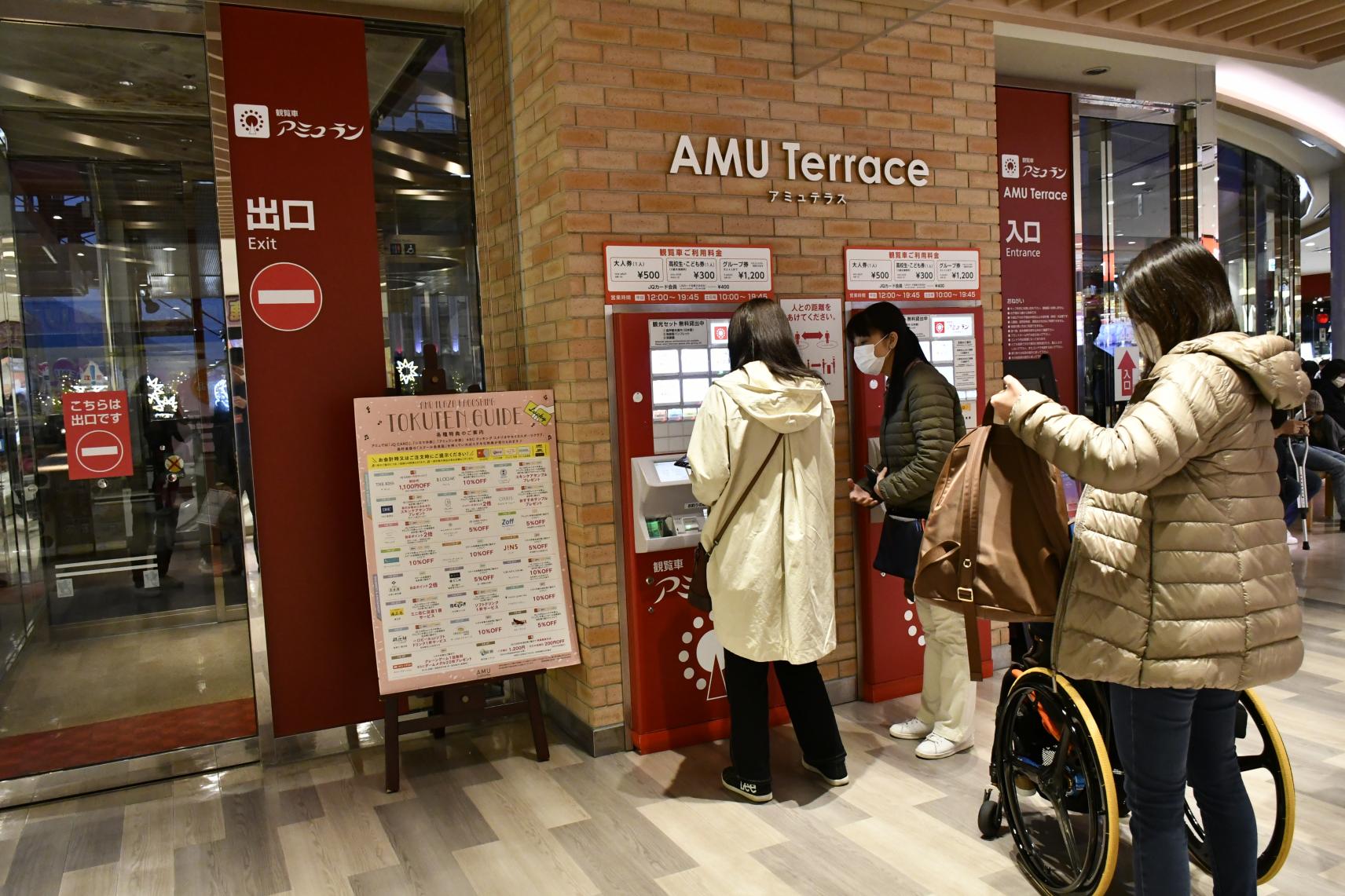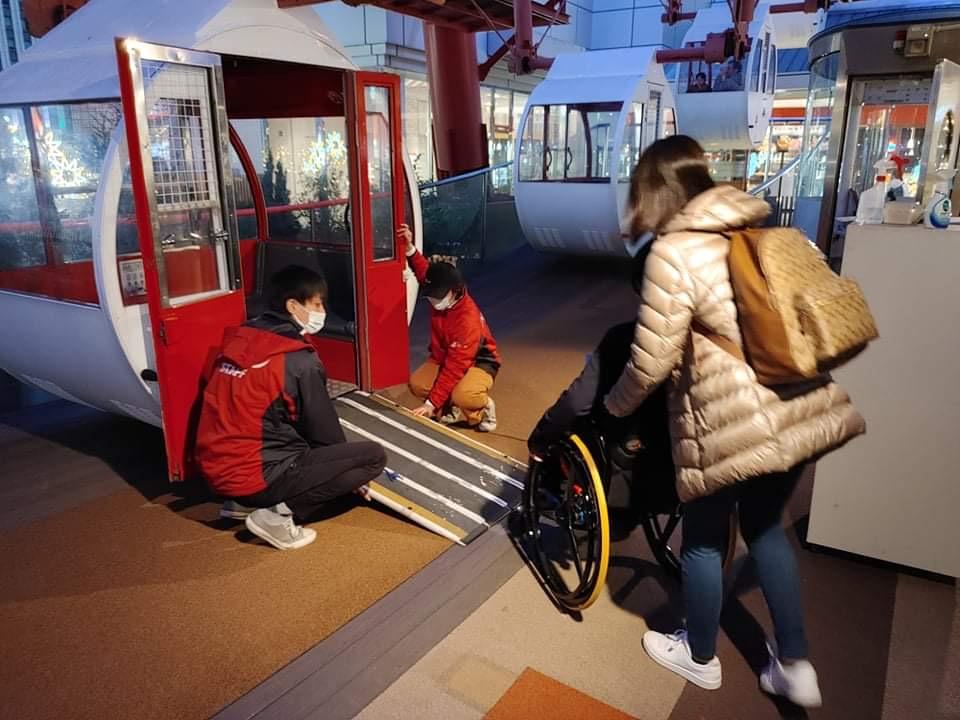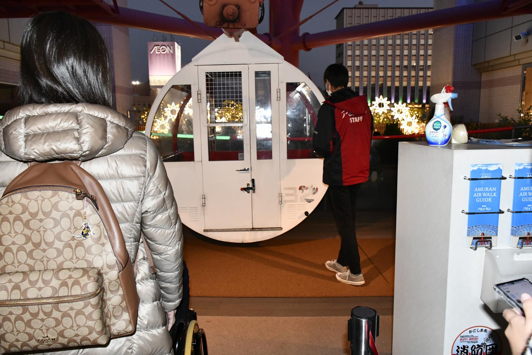 タクシーで約15分、再び鹿児島中央駅へ。ホテルで少し休憩した後に、アミュプラザ鹿児島6階にあるアミュランから夜景を楽しみます。車いす用ゴンドラは2台のため乗車のタイミングを待っていると、観覧車が一時停車し、スタッフさんがささっとスロープを設置。スムーズに3人で乗り込むことができました。「車いすの方の為に停車する旨の事前アナウンスが多い中、今回は特別に車いすに触れないアナウンスだったので、更に気兼ねなく楽しめました。」と、モデルさんも嬉しそう。