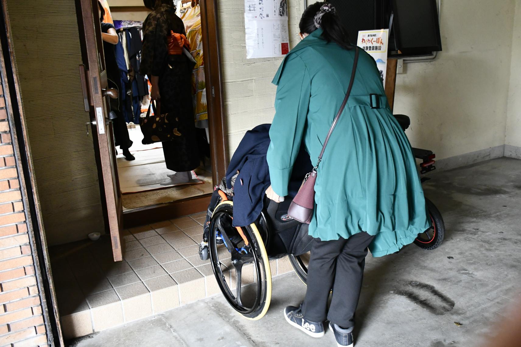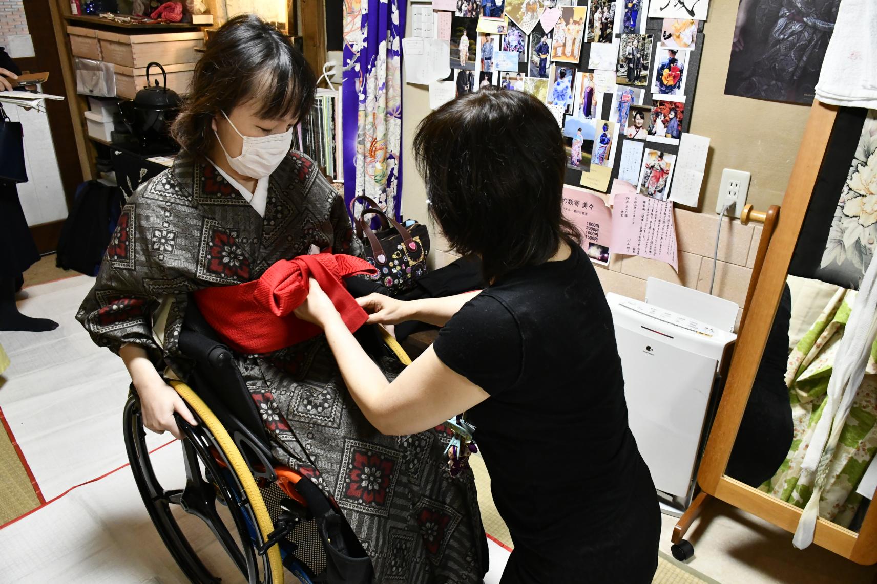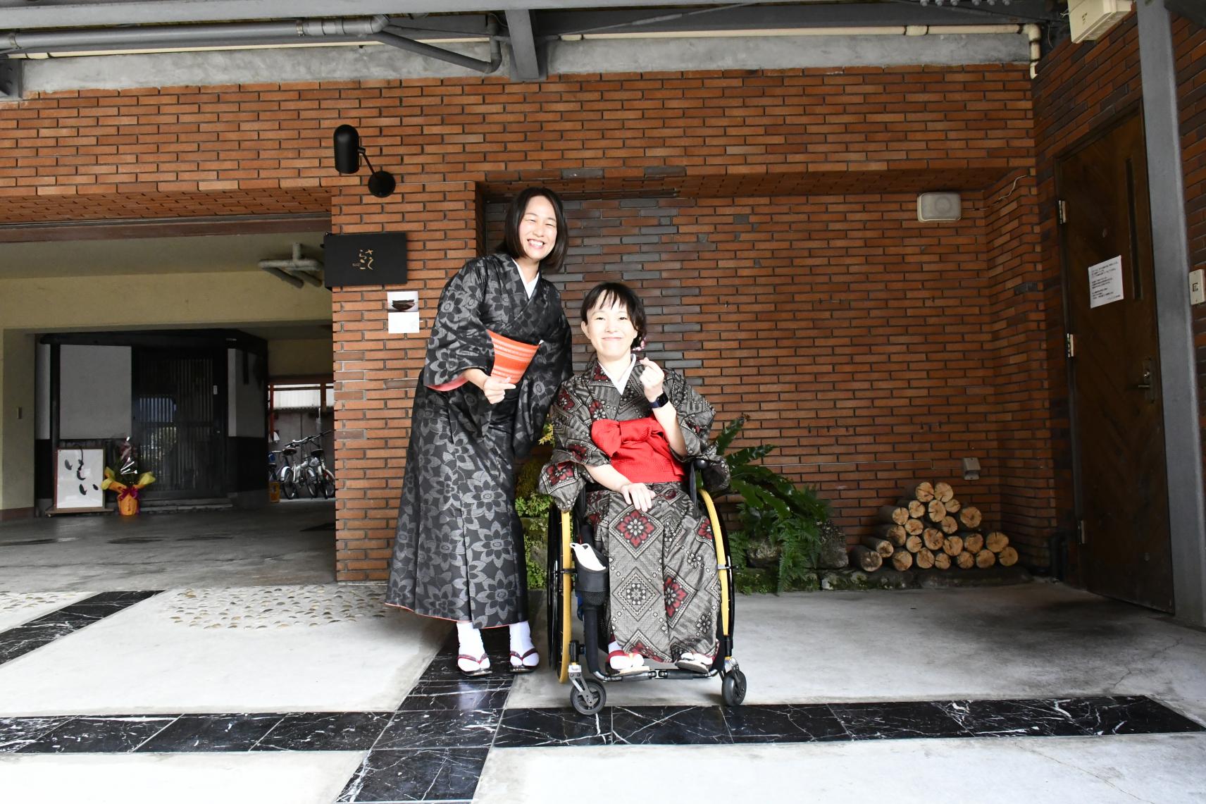 2日目の始まりは、鹿児島中央駅近くのホテルから福祉タクシーに乗り込み10分。照国神社近にある着物の着付け屋さんへ到着です。オーナーは車いすや寝たきりの方の着付けができる資格をお持ちだそう。車いすに乗ったまま上下に分かれた襦袢を着せてもらい、一旦椅子に移った後、着物を広げた車いすに再び移乗し、全体を整えていきます。車いす用にアレンジした着物ではなく一般的な着物を使用するため、数ある着物から好きなものを選べるのも嬉しいポイント。せっかくだからとのことで、鹿児島の伝統工芸品である大島紬を選びました。お二人ともとってもお似合いですね!車いすに触れる背中が苦しくならないよう、前に結んだ帯もとても素敵です。