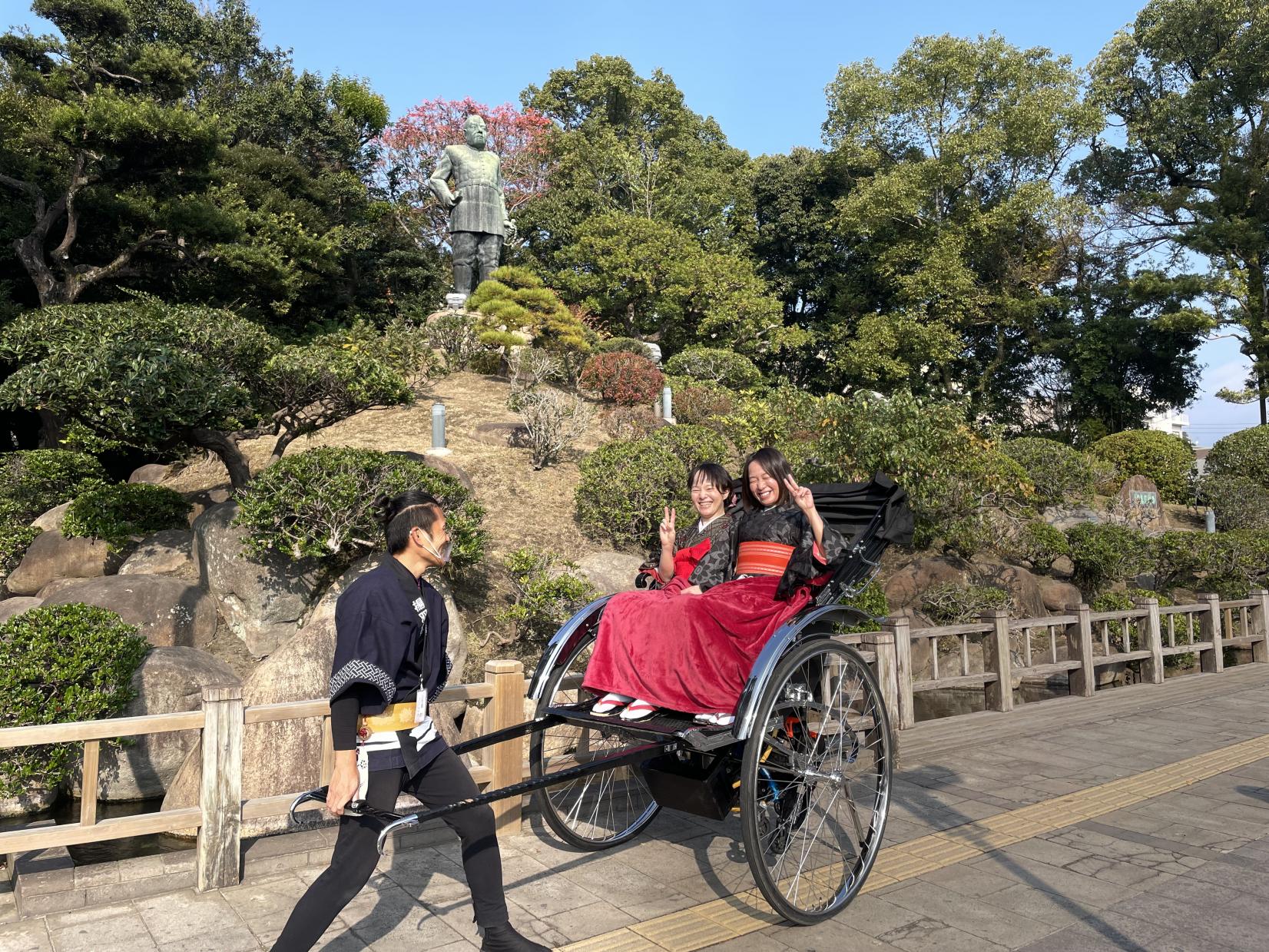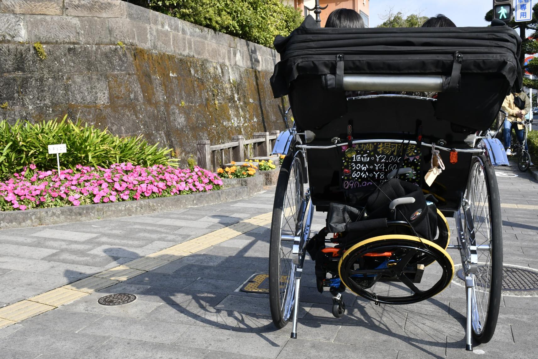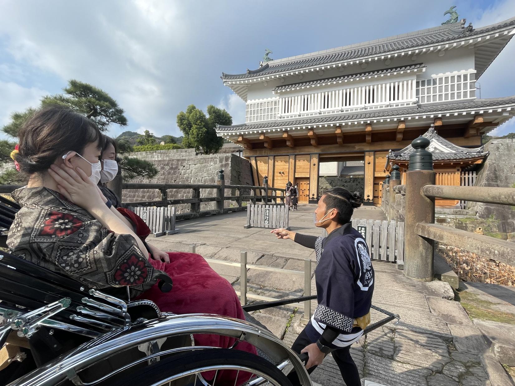 着物の写真撮影が終わったら、迎えに来てくれた人力車へ。西郷銅像前から御楼門までを1時間かけてのんびり散策します。鹿児島生まれの車夫はお話し上手。コミュニケーションを取りながら楽しく歴史を語ってくれるので、お二人の明るい笑い声が絶えません。人力車が映える写真スポットも教えてくれますよ。今回は、念のために車いすを人力車の後ろに積んで行きました。お洋服の場合は、次の目的地で下してもらうこともできますね。
