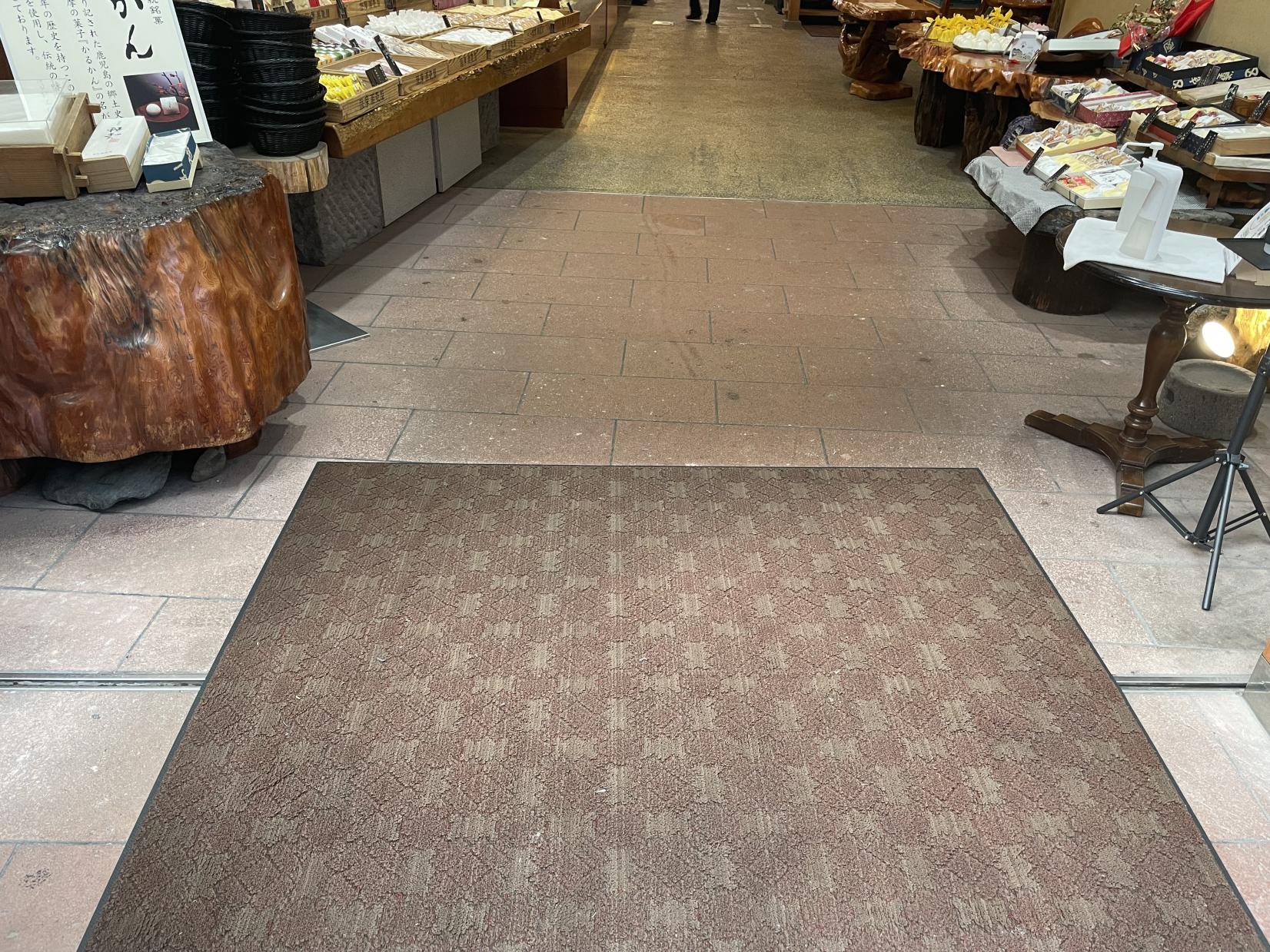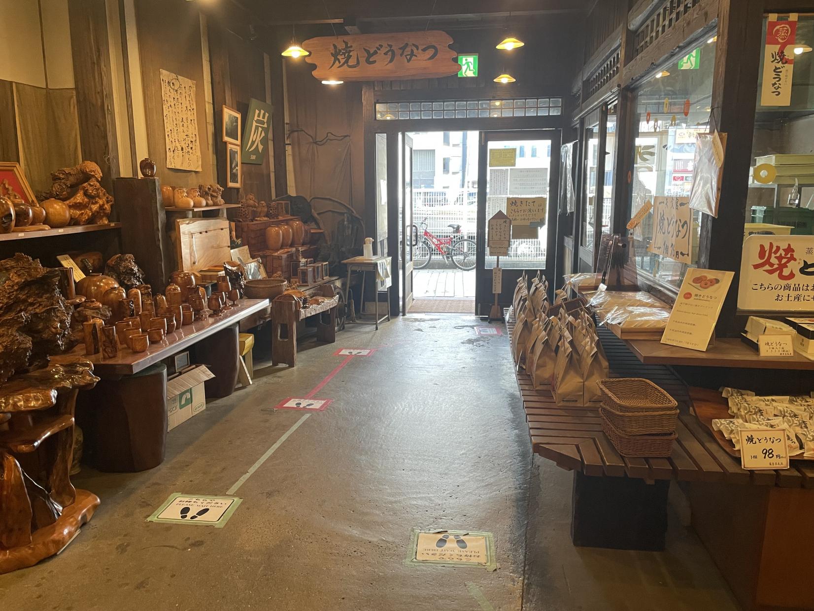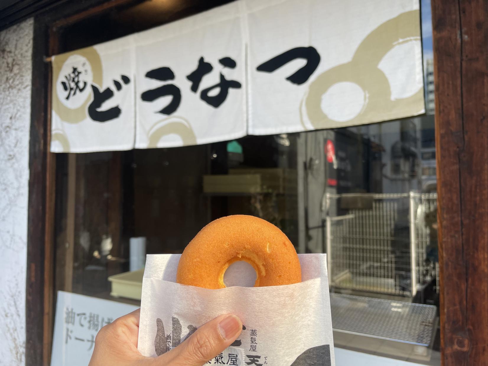 アーケードで続く商店街をぶらぶら。すぐ近くのお土産屋さんに入ると、バターの良い香りが!店内奥で焼いている焼きどうなつの出来立てをいただきます。休憩しやすいスペースもありますよ。