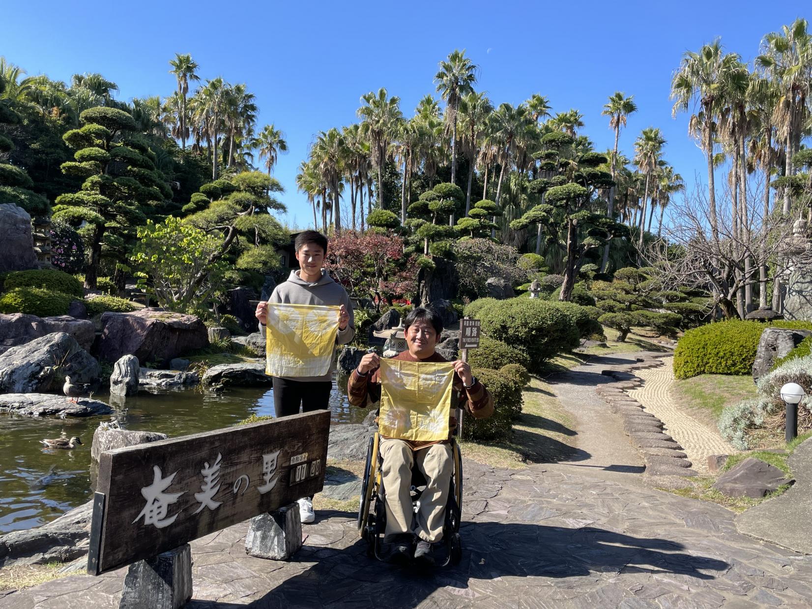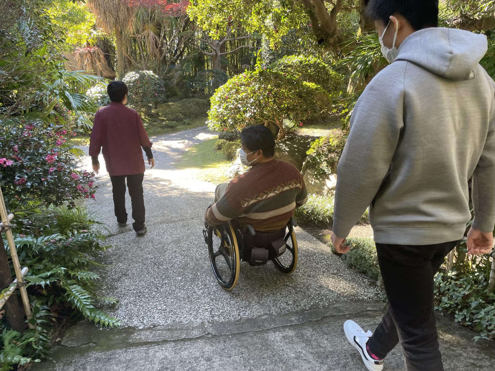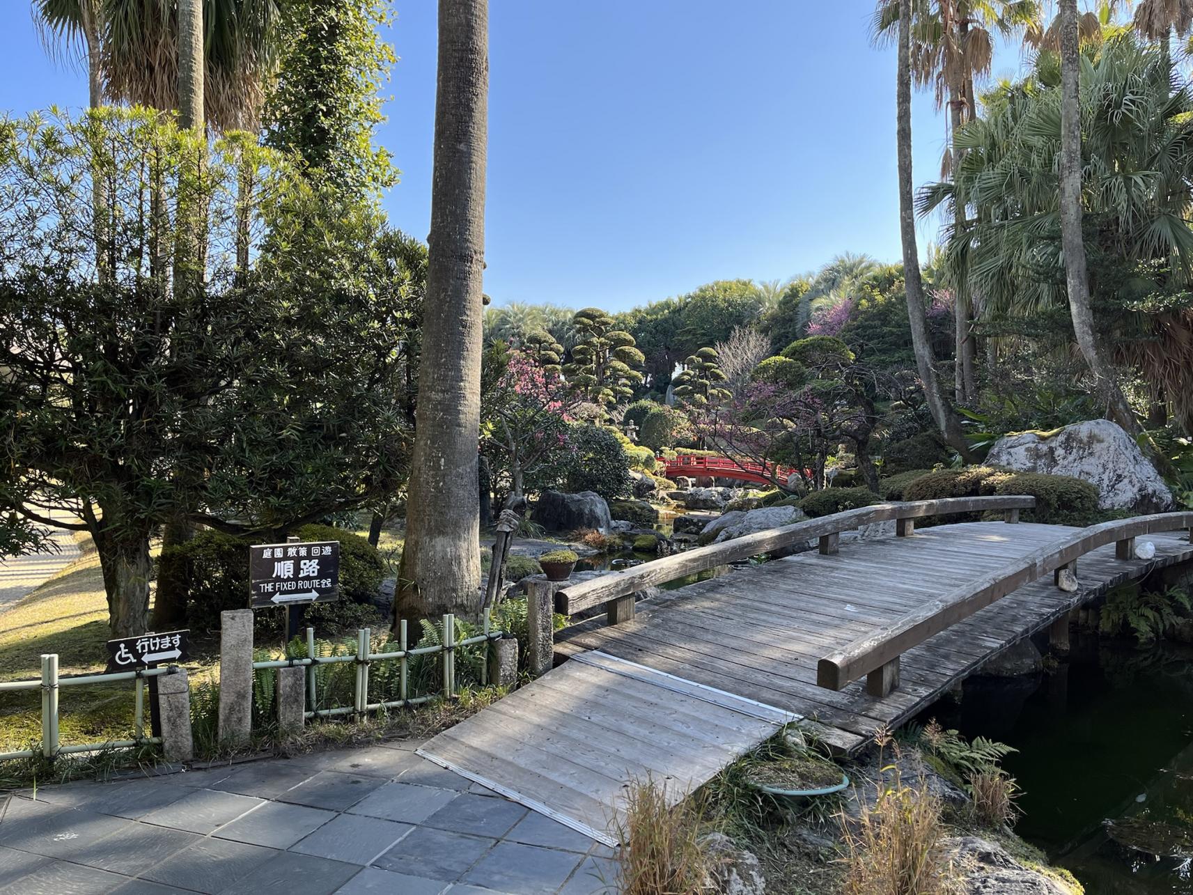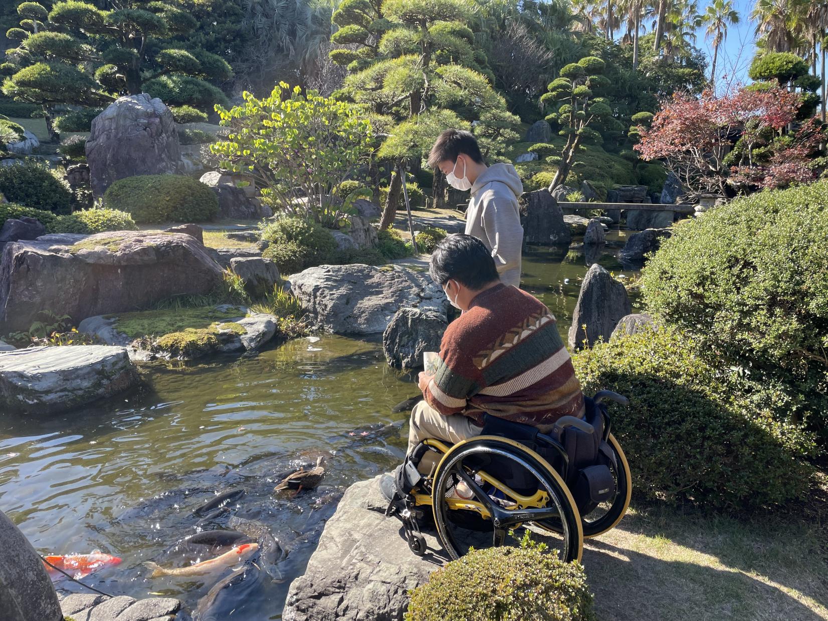 奄美の風を感じながら庭園を散策。バリアフリーに配慮された庭園とあって舗装された通路は段差が少なく、傾斜がある一部の通路のみ息子さんに車いすを押してもらい、スムーズに移動できました。鯉やカモが泳ぐ池を見ながら、のんびりとした心安らぐひと時でした。春から秋にかけては、お花が美しく咲き誇るそう。季節ごとに楽しめますね。