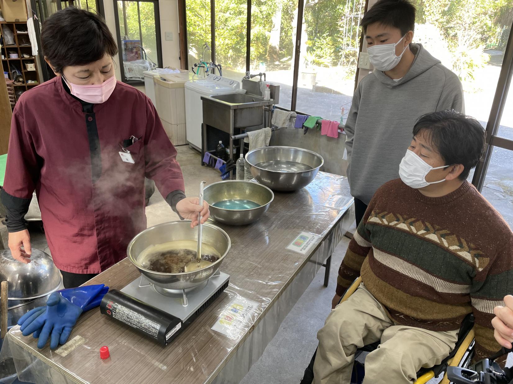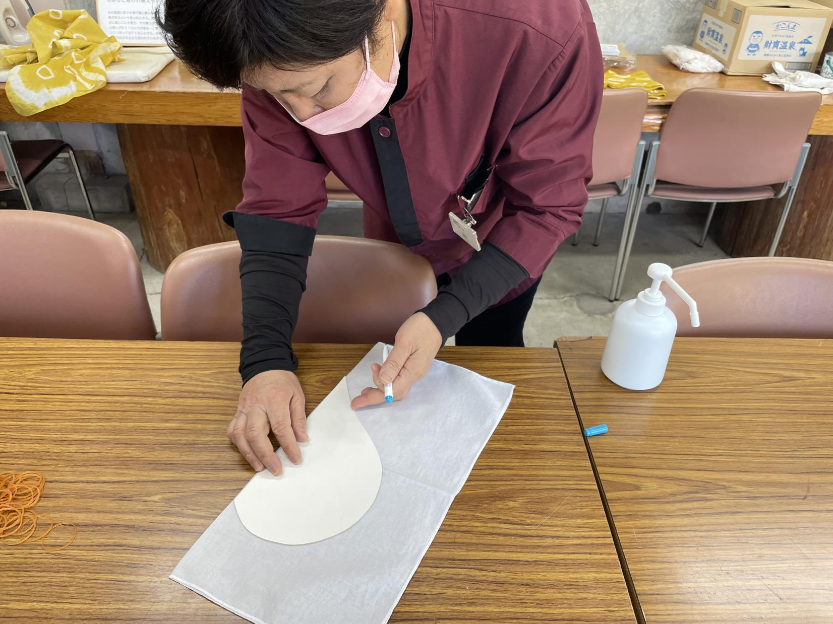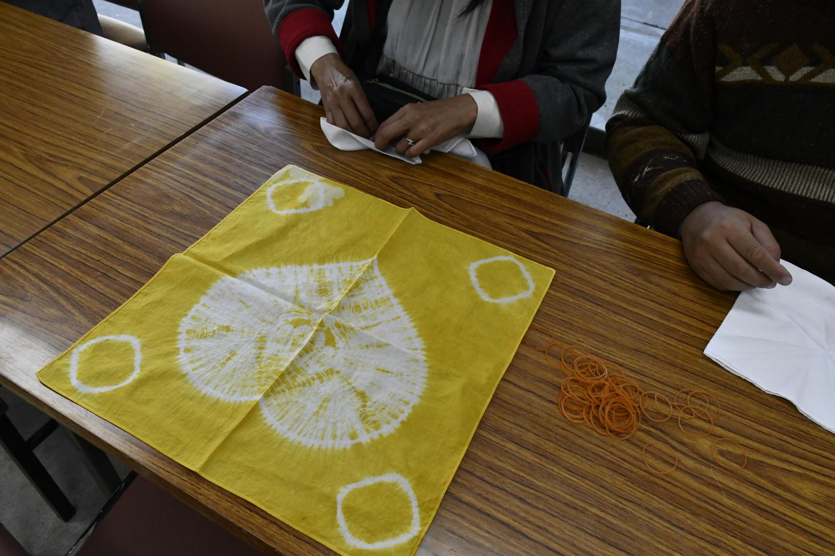 庭園内にある染色工場で、ハンカチの草木染めを体験します。染料となる福木は、奄美から持ってきているそう。様々な柄が作れますが、スタッフさんに丁寧に教えてもらいながらデザインを決定。あっという間に美しい黄色に染め上がりました。元気がでる明るい色合いと世界でたった一つだけの柄に大満足!今回の旅のお留守番をしているご家族のお土産にされるそうです。