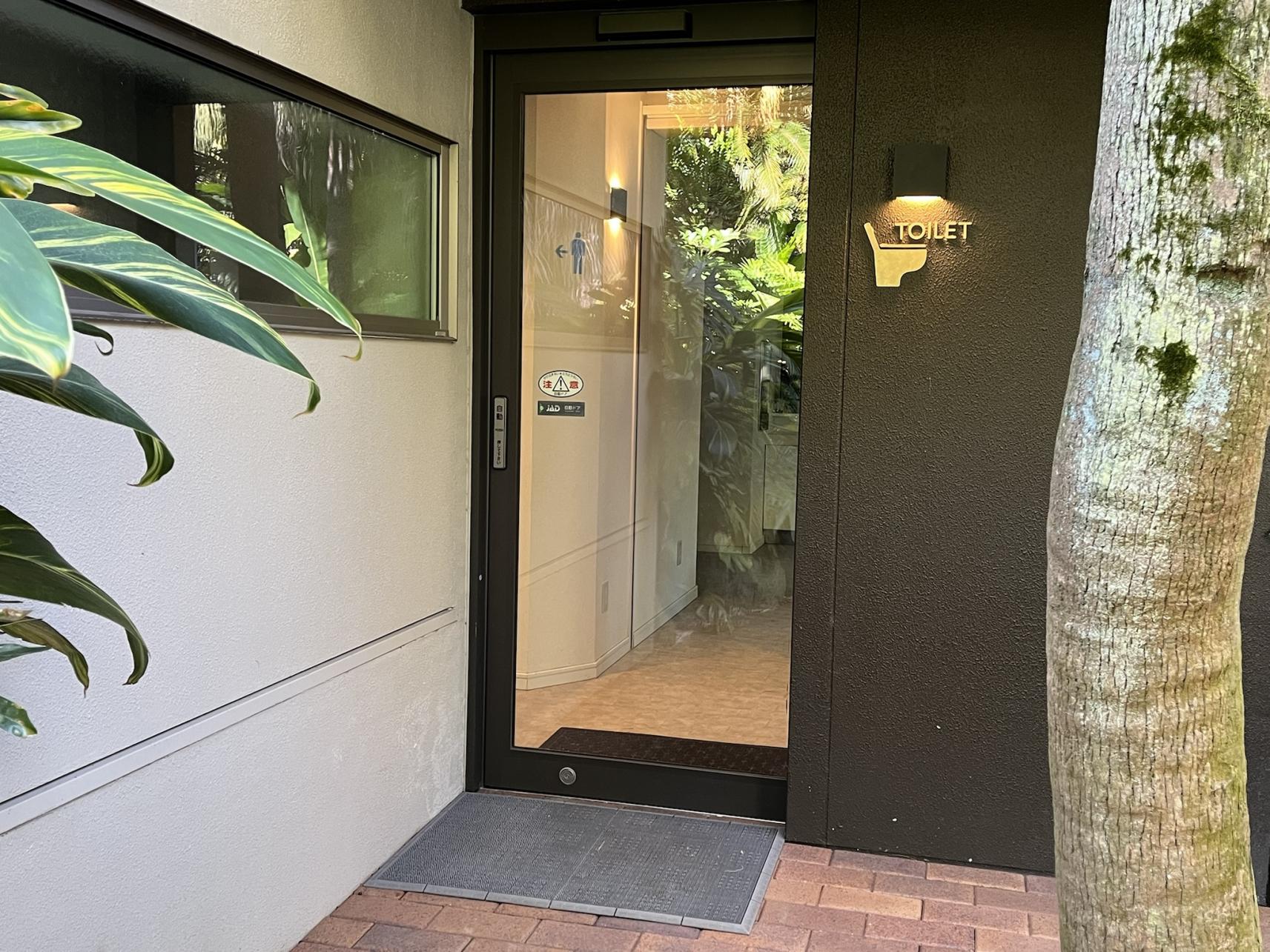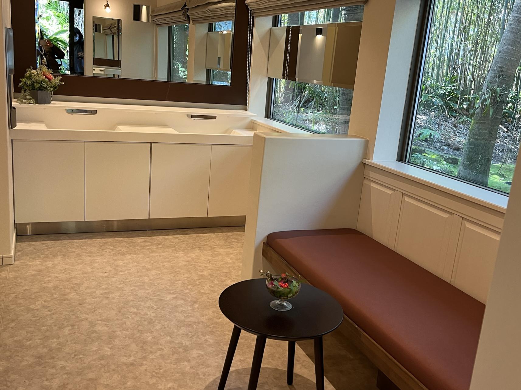 庭園の見学受付でお勧めされるのが、なんと庭園内にあるお手洗い。「お手洗いを紹介するのも恐縮ですが、是非行かれてみてください」とのスタッフさんの言葉を信じて覗いてみると、納得の素敵トイレが!お庭が見えるエレガントなお手洗いは、冷暖房完備。お庭からトイレ内は見えないように設計されているのでご安心を。