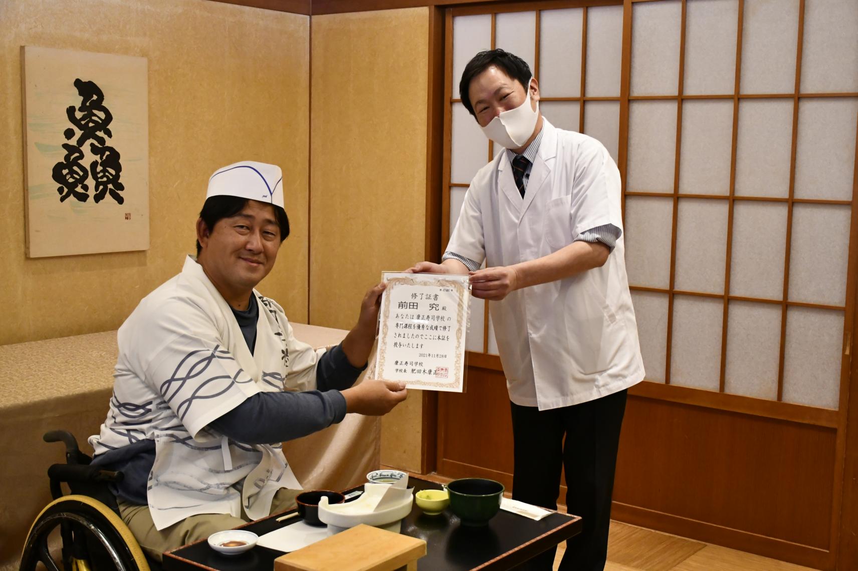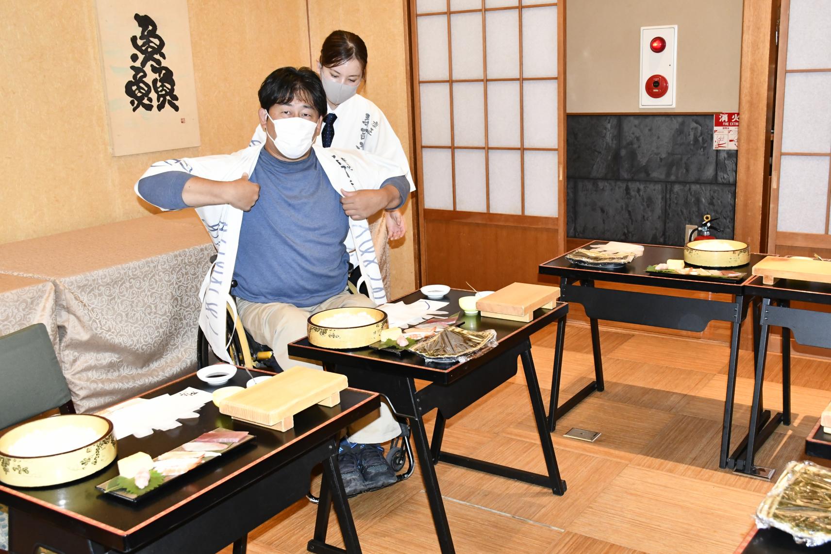 車で20分程移動し、旅の締めくくりのとっておきのランチへ。畳の個室に入ったら、まずはハッピを着て寿司職人に変身。本格的なシチュエーションにモデルさんのテンションはマックス!そして、先生のリズミカルなレクチャーにより、賑やかにお寿司を握ります。モデルさんは、とっても上手にできたお寿司にご満悦。あたたかい天ぷらとうどんと一緒にいただきます。先生によると、お魚の一部は錦江湾でとれたもの、またすし飯は秘密の配合の寿司酢でこだわって作っているそう。そして、最後に先生から名前入りの終了証書を授与され、優秀な成績で寿司学校を卒業!思わず自慢したくなる体験です。