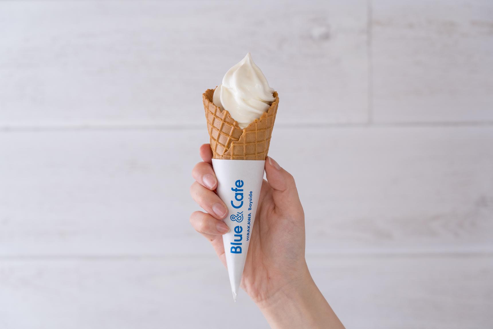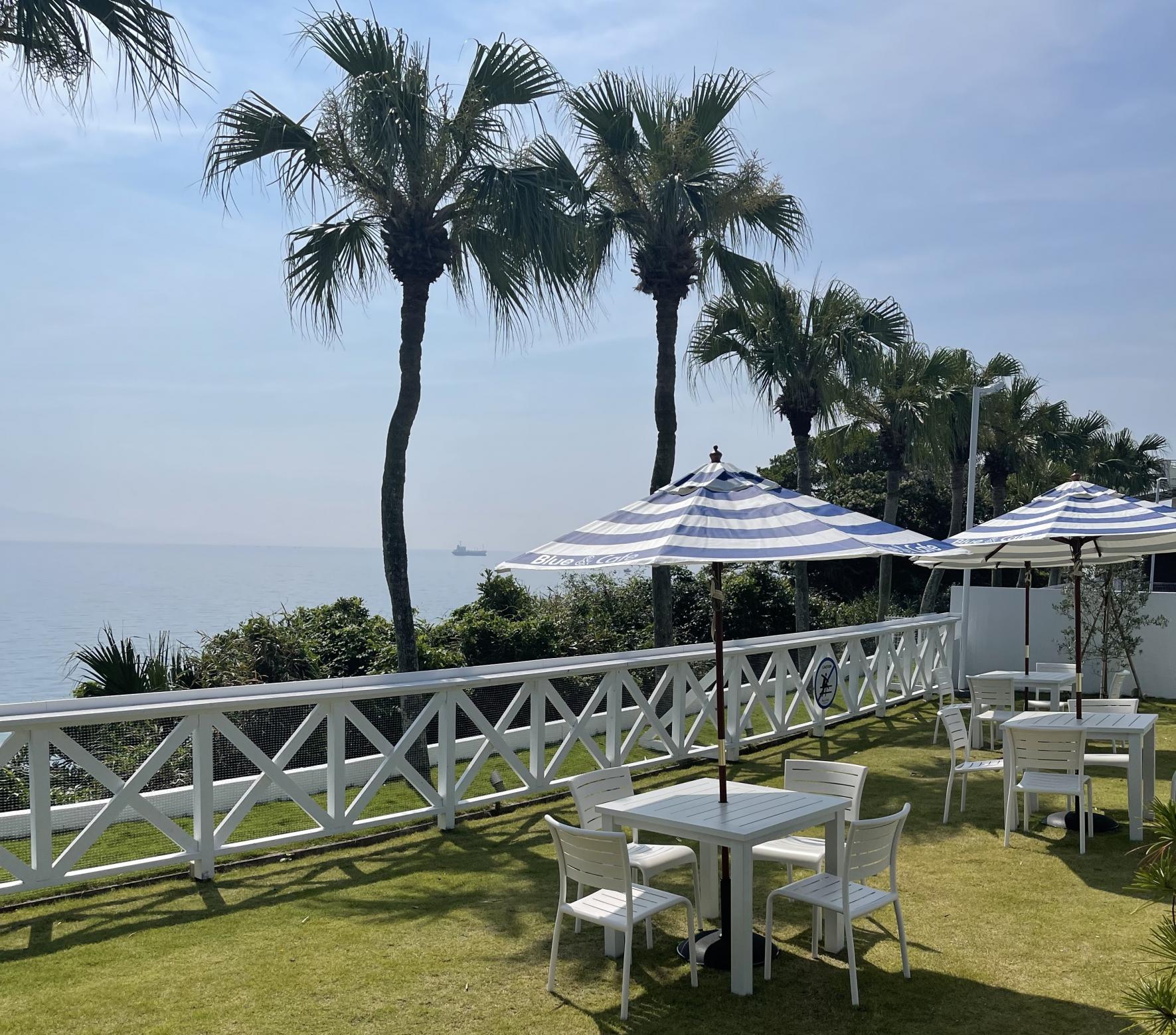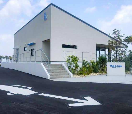 青い海と白い平屋の建物のコントラストに桜島が映える、まるでリゾート気分が味わえるカフェ「Blue & Cafe HIRAKAWA Bayside」。