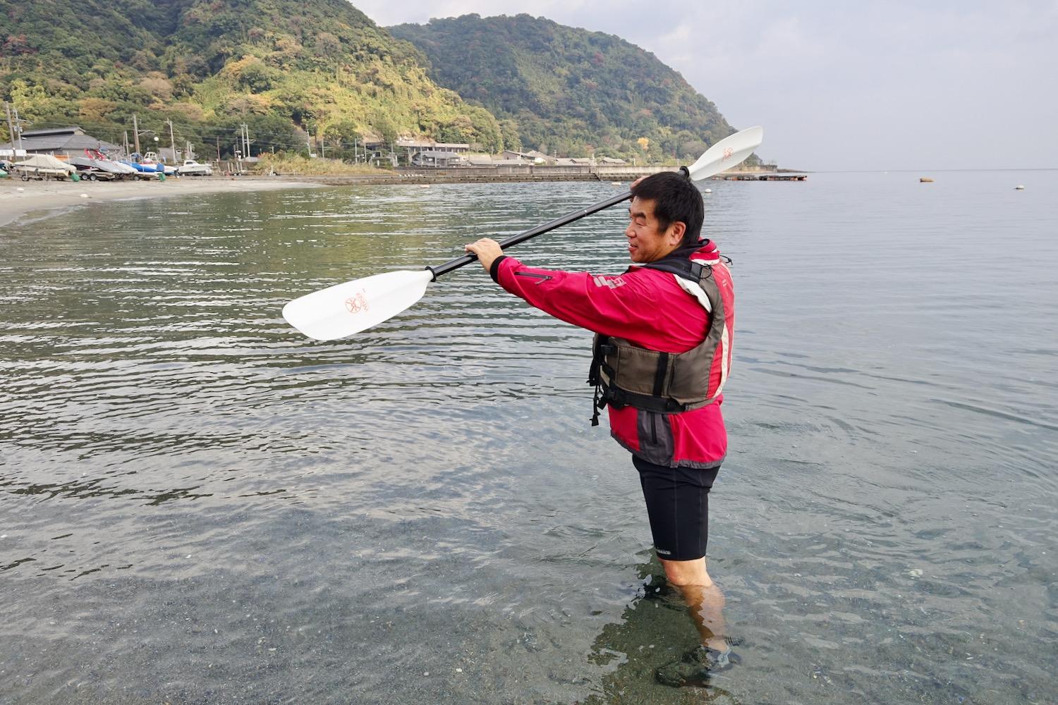 シーカヤックのコーチ兼ガイドは「Wind and Waves」の安部さん。シーカヤック本体や必要な道具(パドルやライフジャケットなど)はすべて用意してくれるので、手ぶらの参加もOK!ただし、シーカヤックは足元が水に濡れることが多く、万一転覆したときのためにも動きやすい服装や着替えは用意しておきましょう。