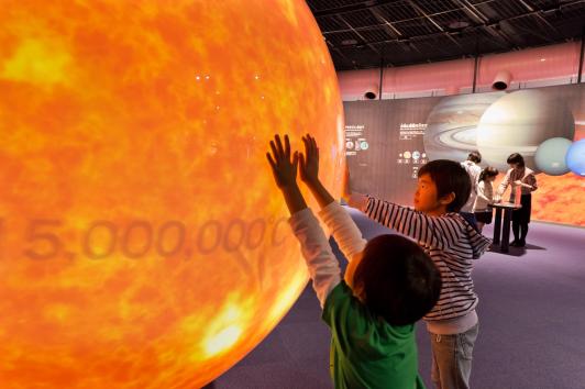 直径23mのドームスクリーンを使った「宇宙劇場」では、満天の星空や大迫力の全天デジタル映像を組み合わせた「プラネタリウム」と世界最大級のフィルムも上映できる「ドームシネマ」を交互に上映、神秘的な星々との出会いや大迫力の映像を楽しむことができます。