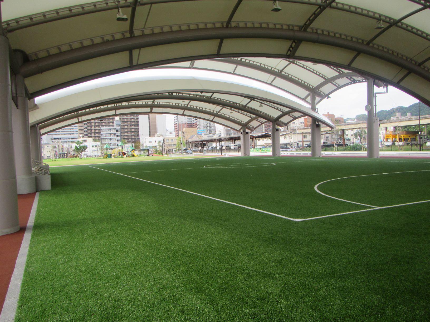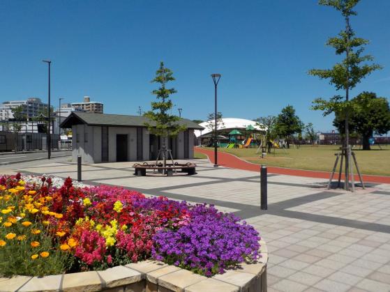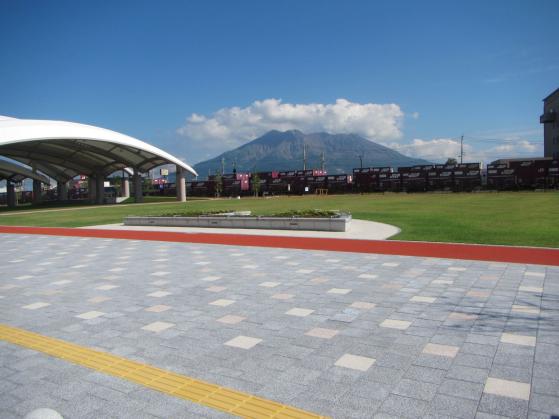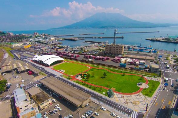人々のふれあい及び交流を促進し、地域のにぎわいを創出するために設置された『かんまちあ』は、桜島と錦江湾を背後に控える約2万㎡の敷地に、屋根付きイベント広場や屋外イベント広場、普通車・大型車駐車場などの有料施設と、複合遊具や健康器具がある上町の杜公園、外周500mのランニングコースなどを備えています。