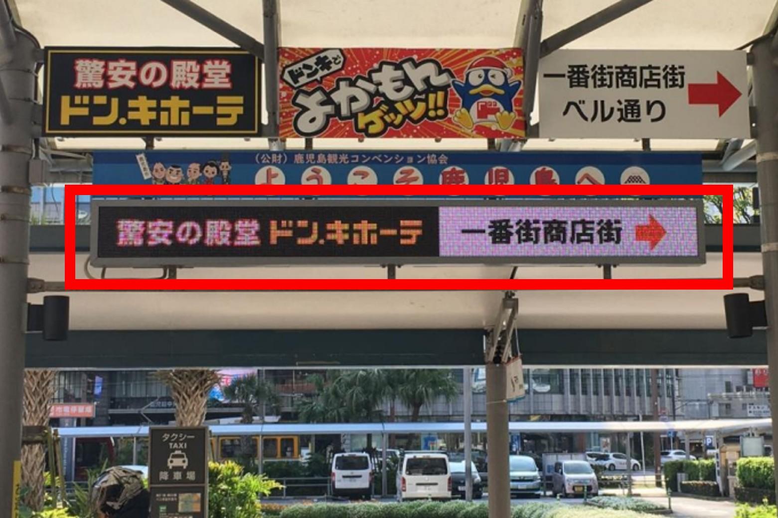 お申し込みはこちら鹿児島中央駅東口の電光掲示版は、新幹線からエスカレーターで1Fロータリーに降りる観光客の目に自然と入ります。