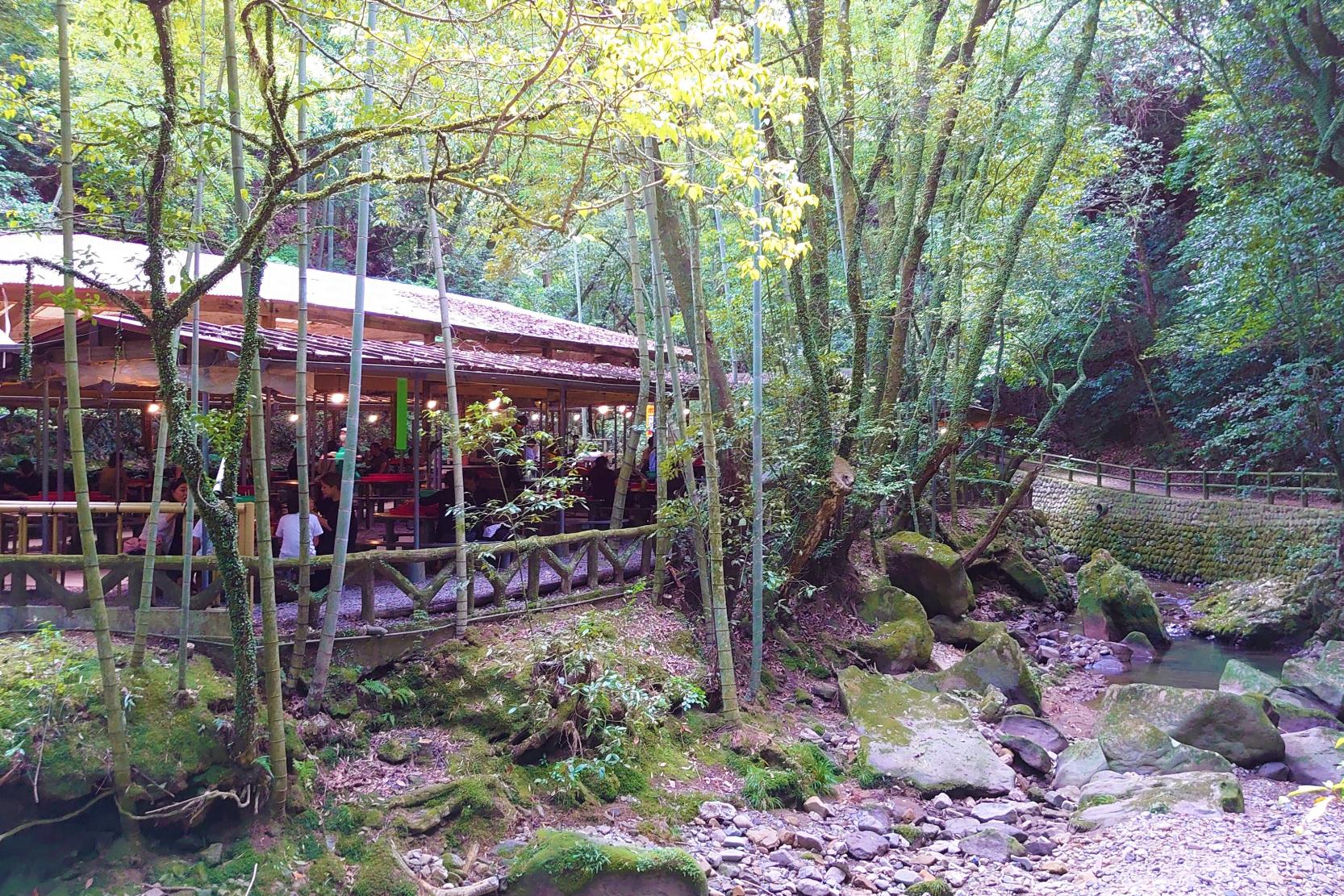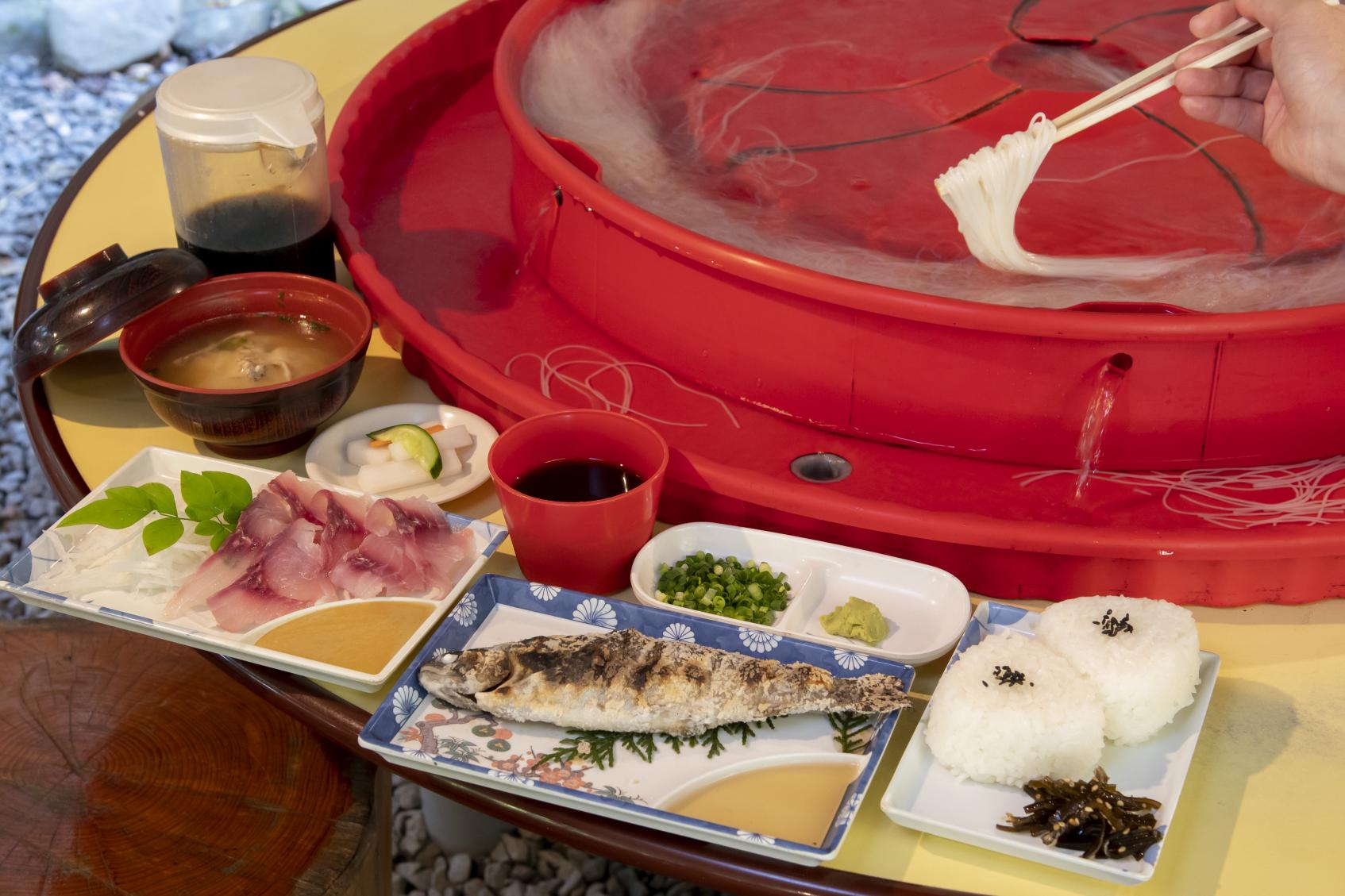 The ‘Somen-nagashi’ at Jigenji Park in Taniyama, Kagoshima City, is a Kagoshima specialty revered by those in the know. This traditional dish dates back to as early as the Tenpo era (1830 - 1844). A local take on Japanese flowing noodles, this “jet-type” somen-nagashi is designed to represent the eruption of Sakurajima. The dish is often paired with grilled trout, carp, and “carp arai” sashimi, as well as jumbo rice cakes, a popular after-dinner dessert.