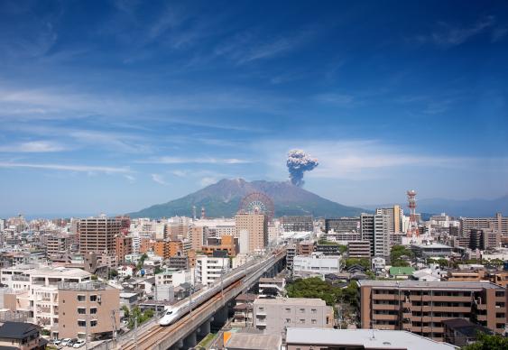 At the highest reach of Amu Plaza’s giant 60-m diameter Ferris wheel, 91 m in the air, you can see Sakurajima beyond the buildings. The Ferris wheel operates until 7:45 pm, so you can also enjoy a night view.
