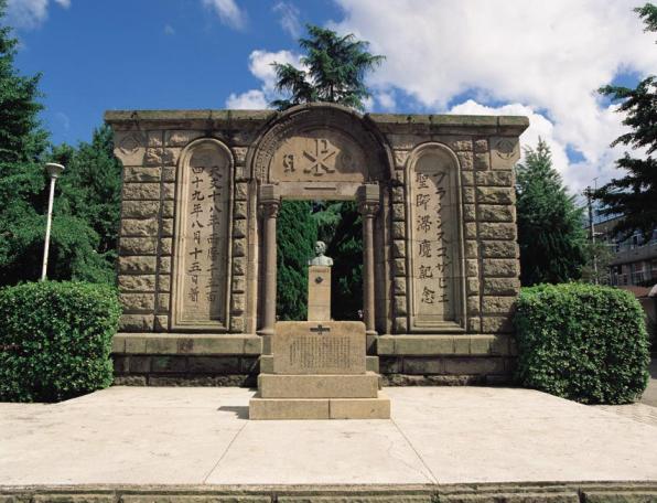 Father Emile Raguet, who created Japan’s first French-Japanese dictionary in the Meiji Period, built the church in honor of Francisco Xavier’s achievements. Most of the church was burned during World War II. A stone wall from the original church still stands in the park together with the bust of Xavier. Based on a donation by the Pope the church was rebuilt in the modern gothic style in 1949 in commemoration of the 400’th anniversary of Xavier’s arrival in Kagoshima. In 1999 three life-sized statues, one of Xavier, one of Bernard the Japanese, and one of Yajiro, the first Japanese Christian from Kagoshima, were erected.