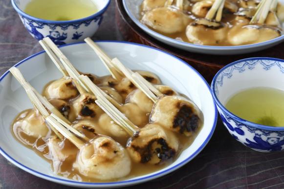 ぢゃんぼ餅は、直径3~4センチに丸めた餅を串に刺して焼き、熱い甘ダレをかけたものです。「ぢゃんぼ」の語源は「両棒」がなまったものといわれ、武士の太刀と脇差になぞらえた串は必ず2本使いされます。145年の歴史がある平田屋では、冬はこたつでぬくぬくしながら、桜島と錦江湾の絶景とともに、やさしい味を楽しめます。