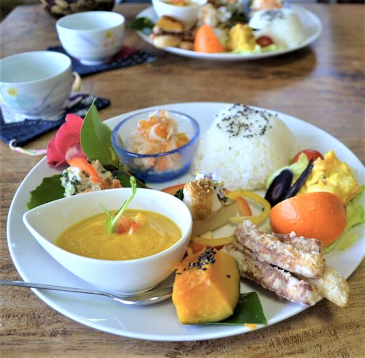 桜島大根・桜島小みかんなどを無農薬無化学肥料で育てる「ファームランド櫻島」。そこで採れた野菜や果物を使ったランチやスイーツが楽しめるカフェです。お昼時には「農家のお昼ご飯」や「野菜カレー」、その他の時間には「シフォンケーキ」などのカフェメニューを味わうことができます。