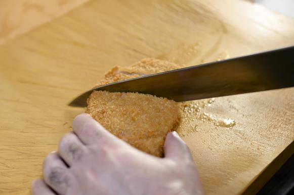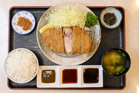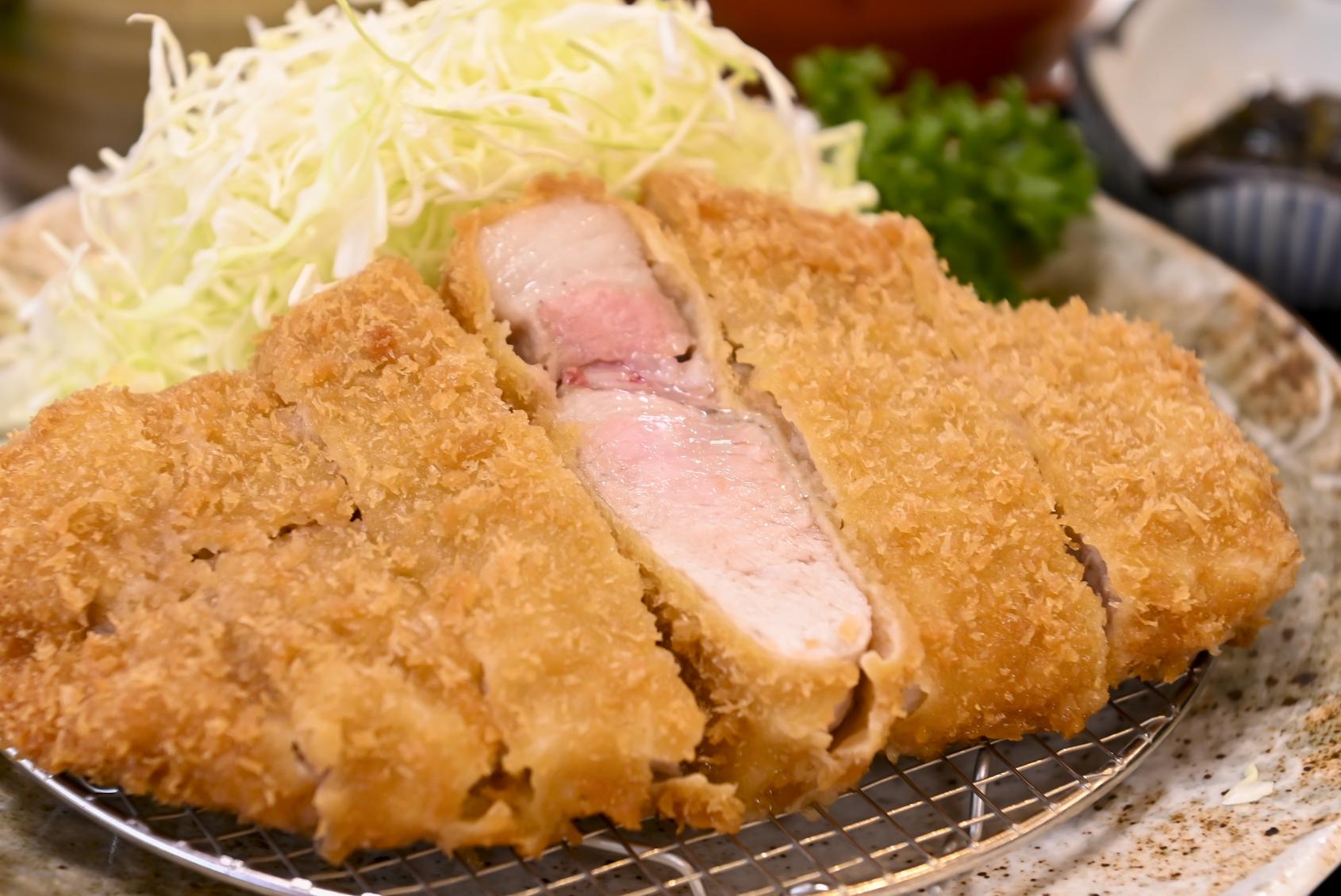 精肉店が営むとんかつ屋さん。渡辺バークシャー牧場の鹿児島県産純粋黒豚と、霧島山麓で育った霧島熟成豚ひなもりポークの旨味を楽しめます。分厚く切った肉に薄めの衣をつけて、低温の油でじっくりと揚げているので、ボリューミーなジューシーさが味わえます。