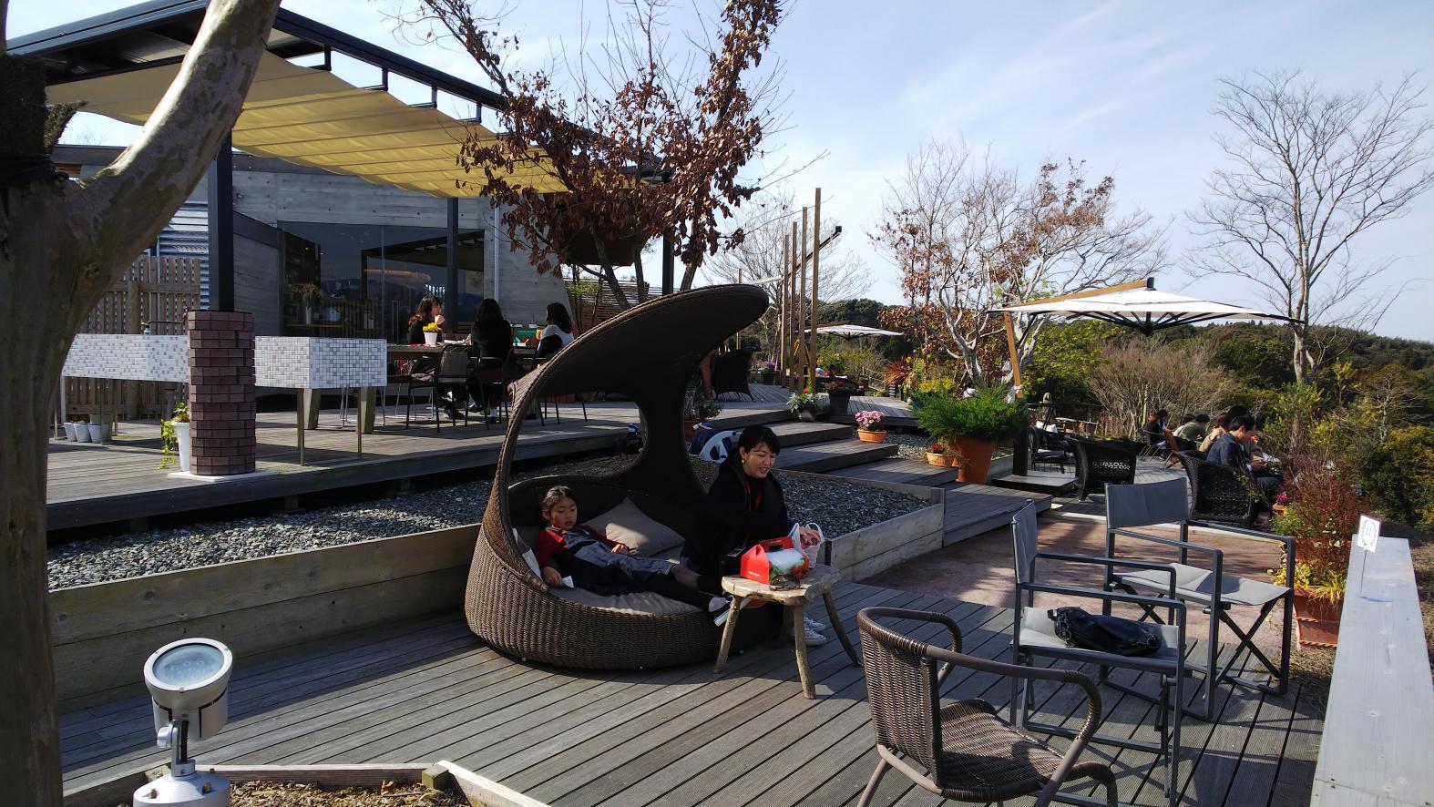 커피, 소프트드링크 외에 '고모레비 농원'산 딸기를 사용한 오픈 샌드위치와 딸기 파르페 등 푸드 메뉴도 충실. 탁 트인 전망 테라스가 큰 인기.