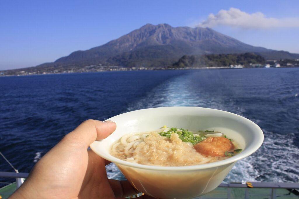 세계적으로도 알려진 활화산 '사쿠라지마'로 향하는 사쿠라지마 페리의 승선 시간은 15분인데 이 짧은 시간에 우동을 먹는 것이 현지 주민들의 즐거움 중 하나입니다. 바닷바람을 맞으며, 웅대한 사쿠라지마와 긴코만을 바라보며 먹는 우동은 각별합니다. 어쩌면 사쿠라지마가 분화하는 모습을 볼 수 있을지도 모릅니다.