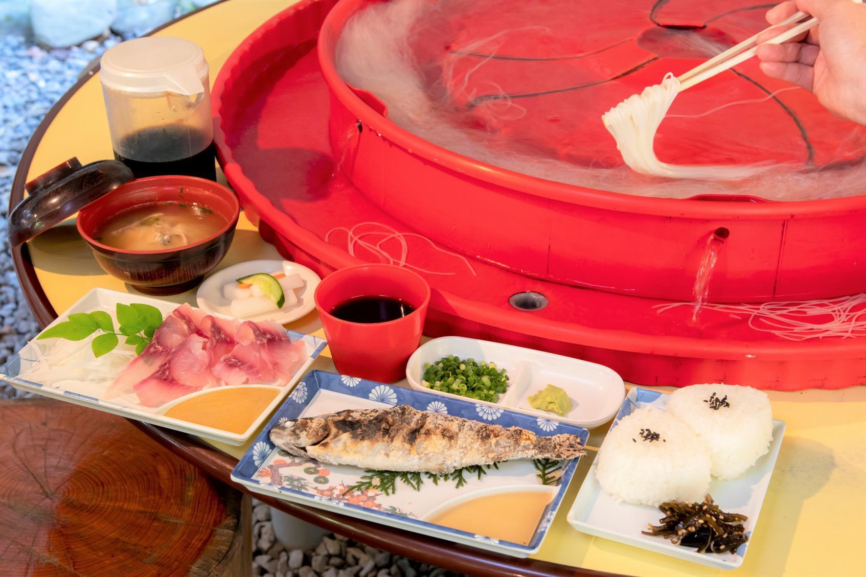 여름이 되면 일본 각지에서 즐길 수 있는 '소멘나가시(흐르는 물에서 소면을 건져 먹는 식문화)'. 3월 중순부터 10월 말까지 영업하는 지겐지 공원의 소멘나가시는 사쿠라지마의 분화를 이미지화한 소멘나가시용 기계를 사용합니다.