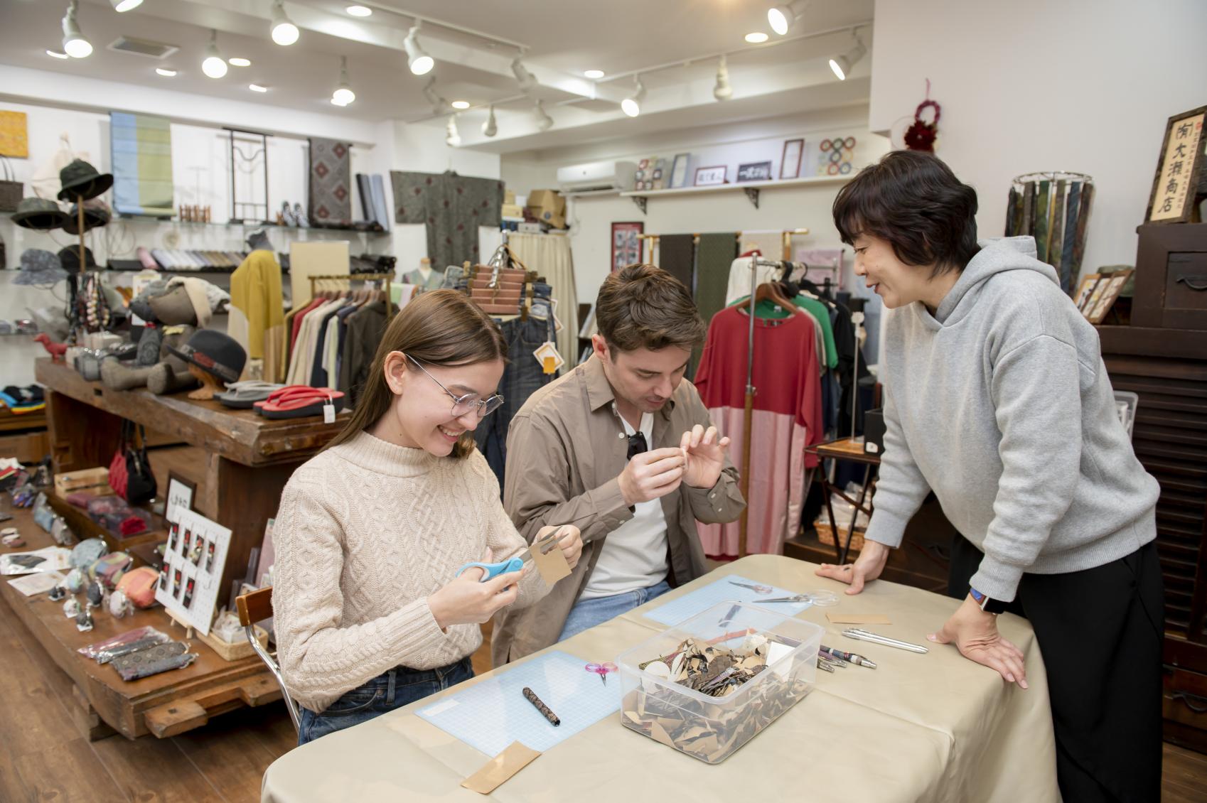 아마미오시마가 생산지인 국가 지정 전통적 공예품 “본고장 오시마 명주”의 매력을 널리 보급한다는 목적으로, 기모노뿐만 아니라 생활 잡화나 인테리어 소품을 취급하는 가게가 있습니다. 이곳에서는 오시마 명주 자투리천을 아낌없이 사용해 오리지널 볼펜 만들기 체험을 할 수 있습니다. 한 가닥의 실을 염색하는 데, 다정큼나무를 삶은 염료에 담그고 진흙 밭에 들어가 온몸이 진흙투성이가 되어 진흙 바르는 작업을 수십 회에서 많게는 100회. 그렇게 물들인 실을 고도의 기술로 짜내려 가면 정교한 무늬의 명주가 완성됩니다. 장인들의 솜씨를 접해 보고, 간단한 베짜기 체험도 가능합니다.