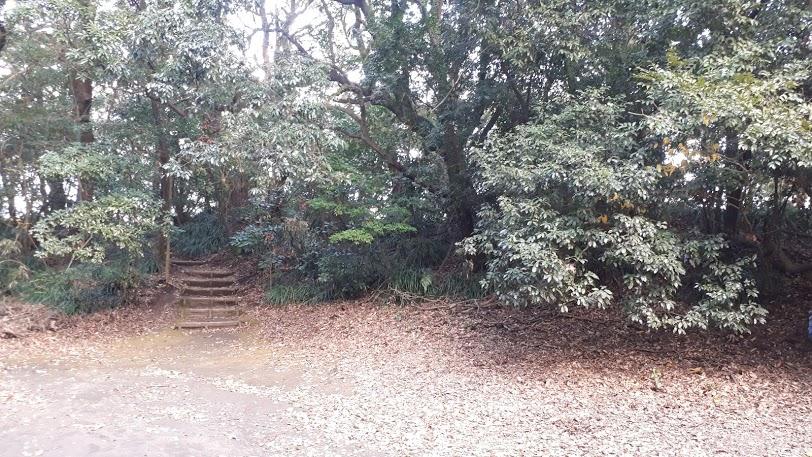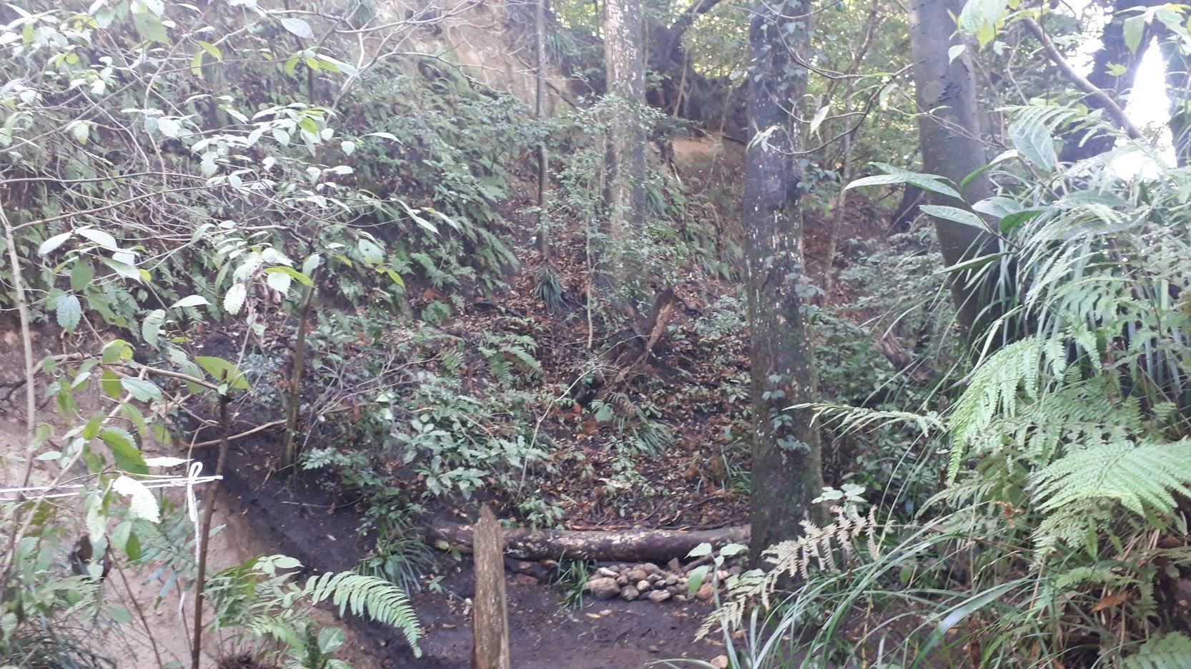 土塁の右側はシラスの崖を削って出来たV字形の谷で水のない空堀です。鹿児島の山城はシラス台地上に作られた山城が多く回りには空堀が多いです。