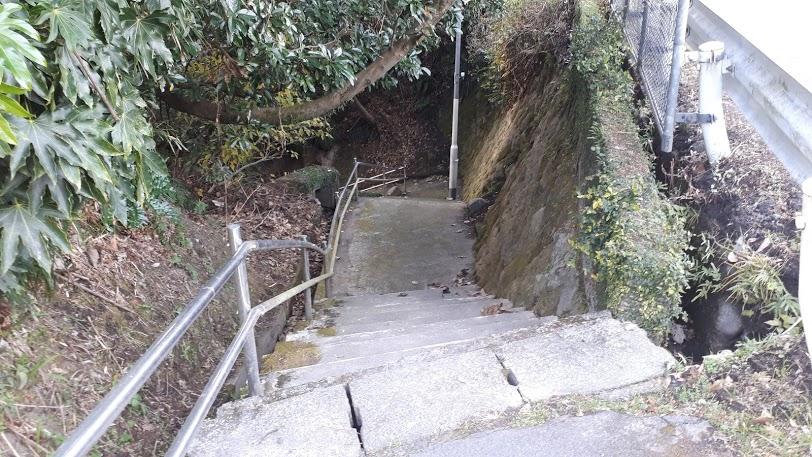 城山のテレビ塔の西側は切り立った崖となっています。この崖はシラスの崖を切り取ってできた切岸です。切岸の高さは30mを超すほどでこの崖の上に山城の本丸があります。徳川幕府が一国一城令を出すまではここが城の本丸で島津一門の島津常久が城代として務めていました。