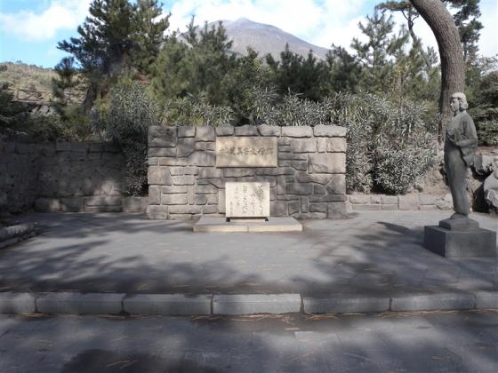 『放浪記』作者、林芙美子文学碑と雄大な桜島