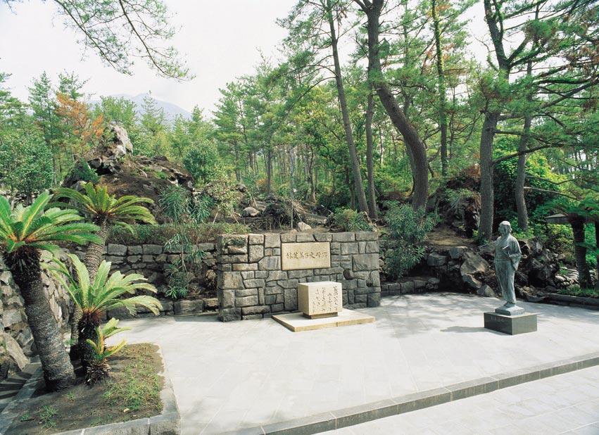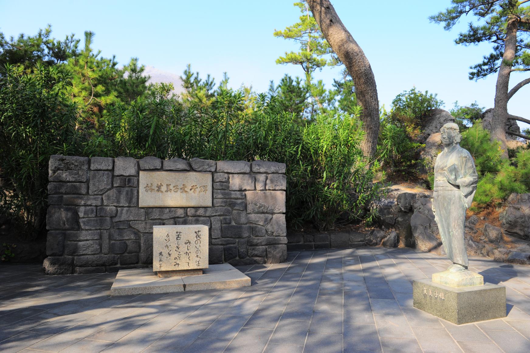林芙美子の母親は桜島の出身で、芙美子も鹿児島市で一時期を過ごしました。芙美子の本籍地である古里町に、銅像2体と「花のいのちはみじかくて苦しきことのみ多かりき」と刻んだ文学碑が建てられています。
