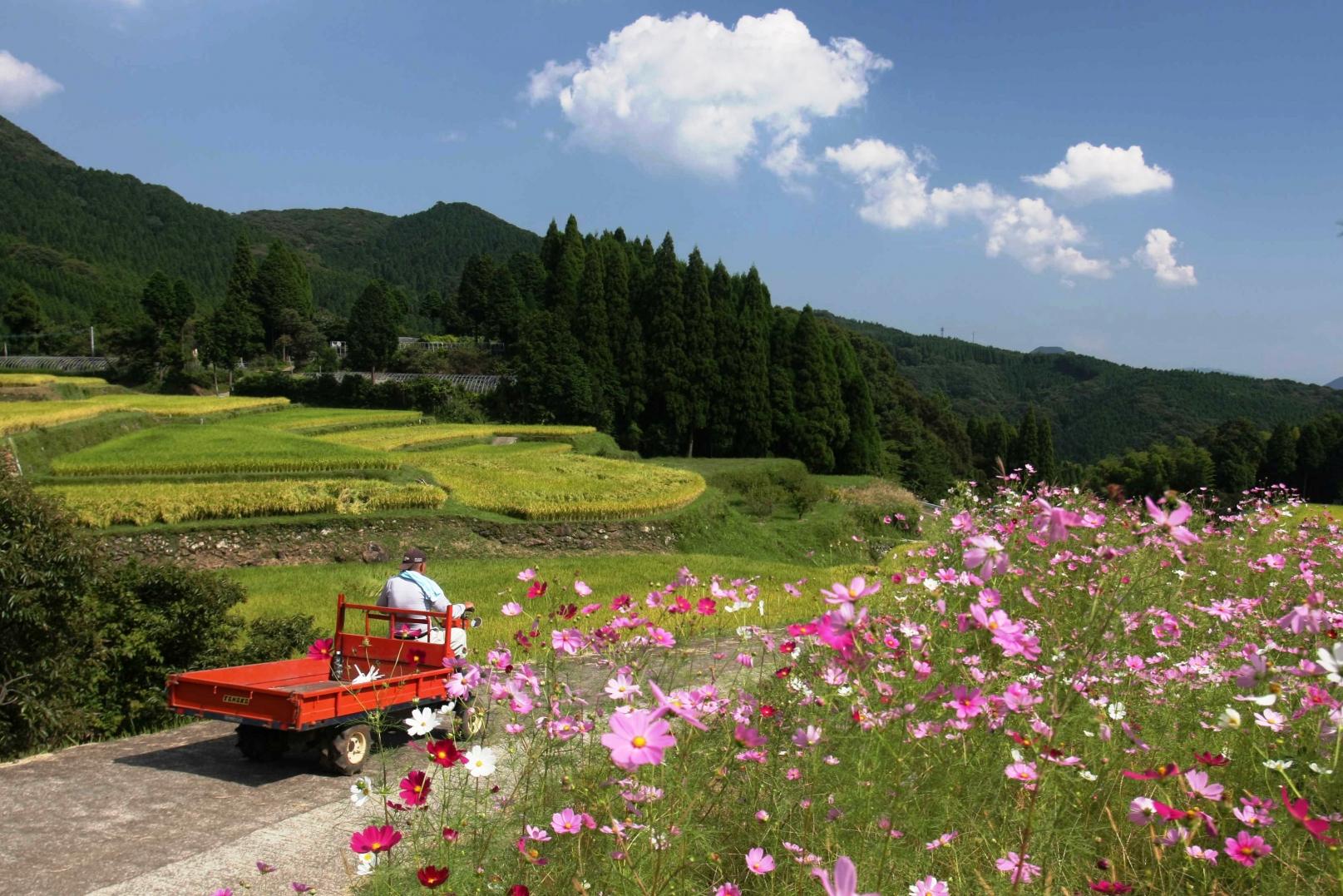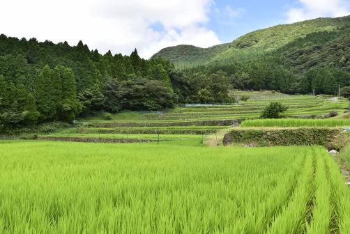甲突川の源流域である鹿児島市郡山町の八重地区の急傾斜地に広がる、全面積12,4haの約240枚からなる石積みの棚田です。この美しい棚田を維持保全する活動を展開している「八重地区棚田保全委員会」が中心になって開催される「農業体験in八重の棚田」や、棚田オーナー制度のグリーンツーリズムが体験できます。