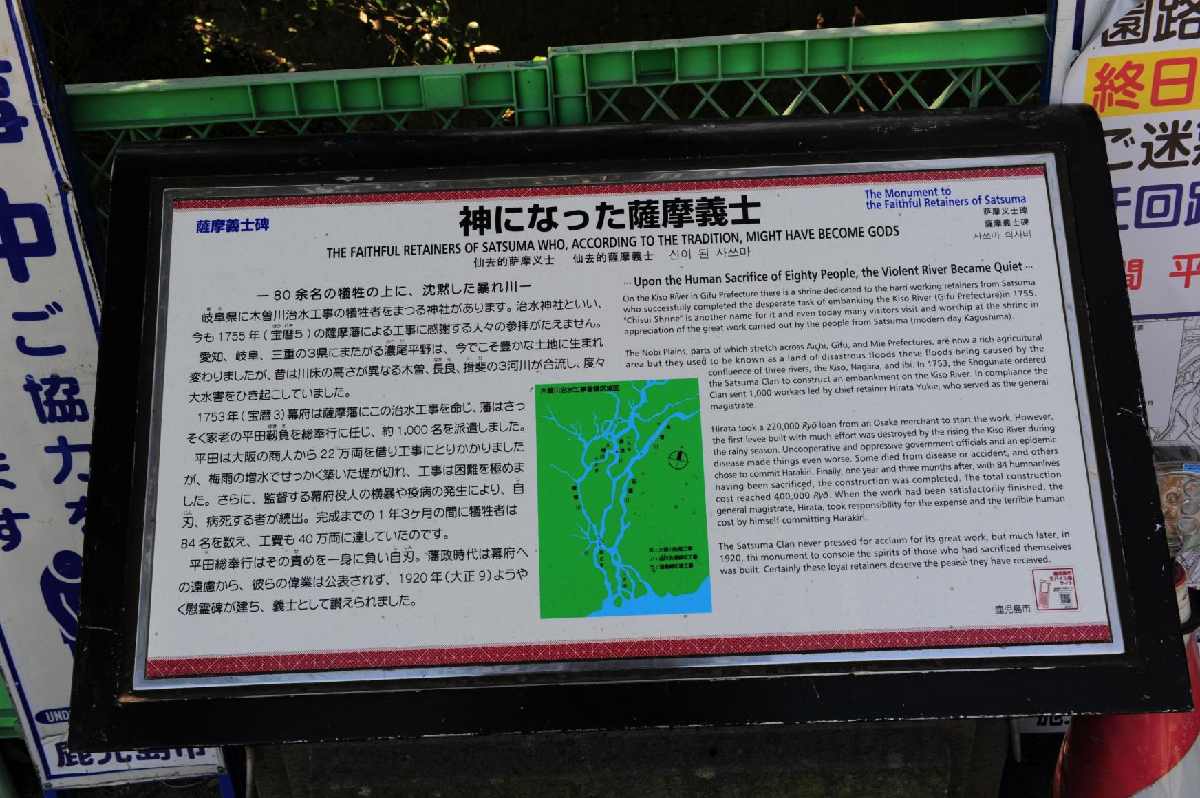 木曽川・揖斐川・長良川(岐阜県)の改修工事は非常に困難であり、約1,000人を動員し工費40万両を費やし、1年3ヶ月かけて完成しました。その間、幕吏や地域住民との対立、 悪疫の流行などで88名の犠牲者をだしました。その供養墓塔として薩摩義士碑が1920年に建立されました。