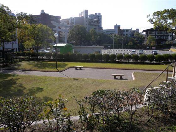 二の丸庭園であった探勝園のあとには、斉彬が本丸と電信の実験を行った電信使用の地の碑や探勝園の碑がたっています。探勝園は、島津家第25代当主重豪公のときにつくられ、はじめは千秋園と呼ばれていました。27代当主斉興公のときに手を加え探勝園と名づけられました。すばらしい庭園であったといわれます。