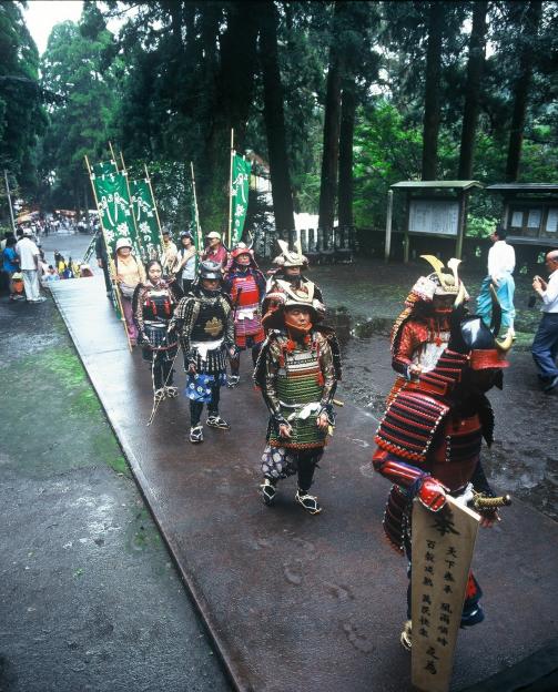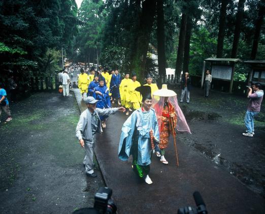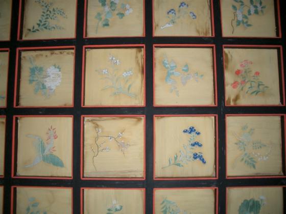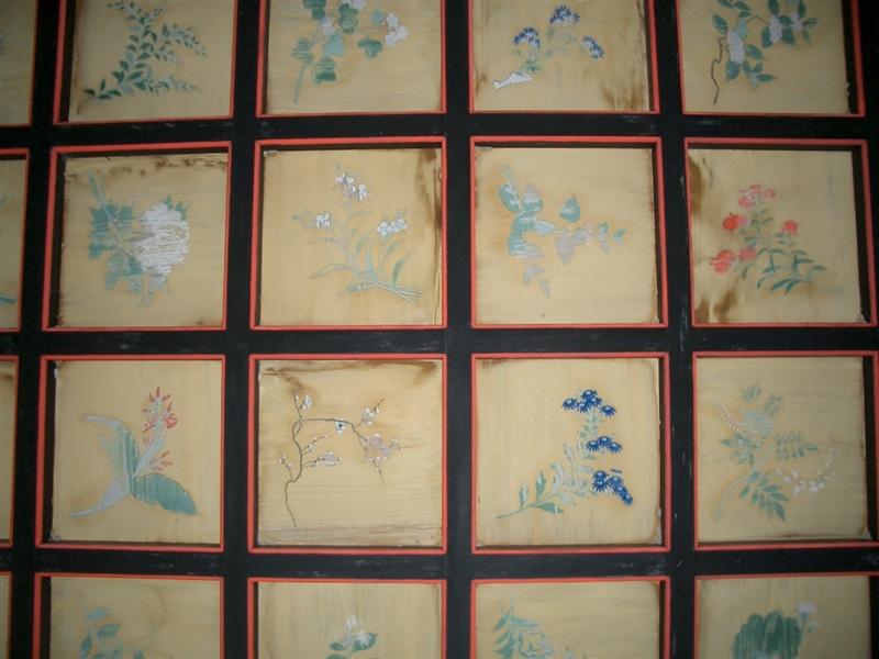 うっそうとした森林に囲まれ、両側の苔むす老大木、緑と朱塗りの華麗な権現造の社殿は、日光東照宮に似て美しいことから「さつま日光」と言われています。内部の天井は、格子天井として、その一つ一つに草花の絵401枚が描かれ、床は板張り敷き、壁面は木連れ格子を組み蔀戸(しとみど)も使われています。