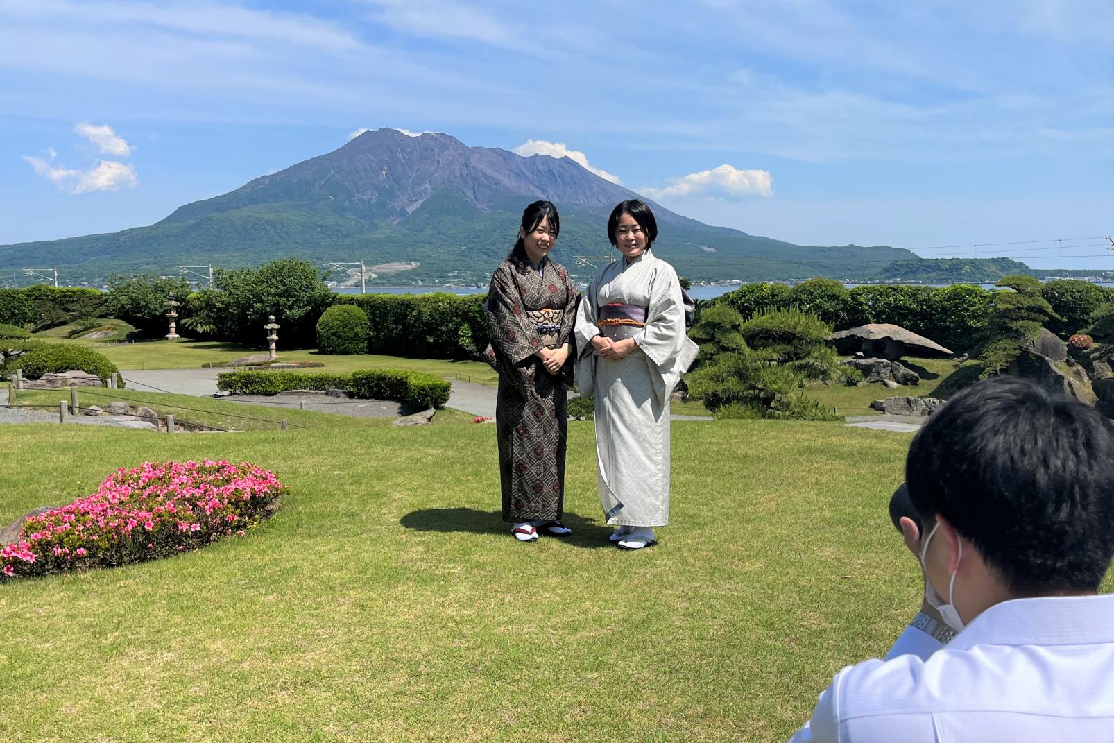 在仙巖園,能在歷史悠久的日本庭園中穿著和服,遠眺櫻島欣賞風景。