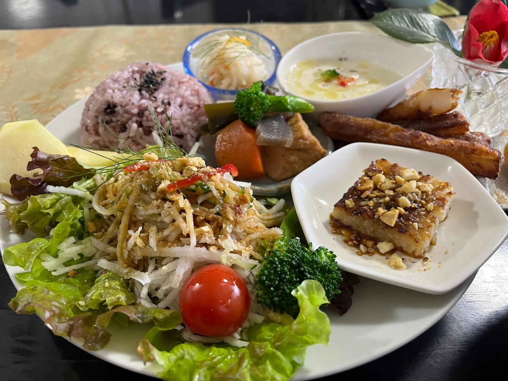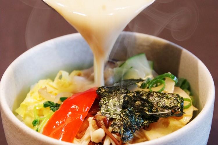 由经验丰富的和食主厨反复研究推出的“鹿儿岛五彩时令蔬菜芝麻豆乳药膳汤饭”,用海带高汤、芝麻、豆乳代替含有鸡肉等一切动物性食材。如同奄美大岛的乡土料理鸡饭一般,作为待客的最佳之餐,耗时精心烹制而成。淋上浓郁美味的汤汁的五彩时蔬汤饭,等您来享用。